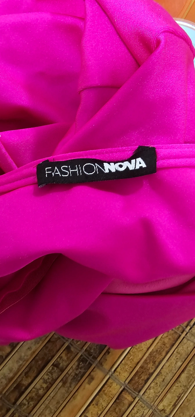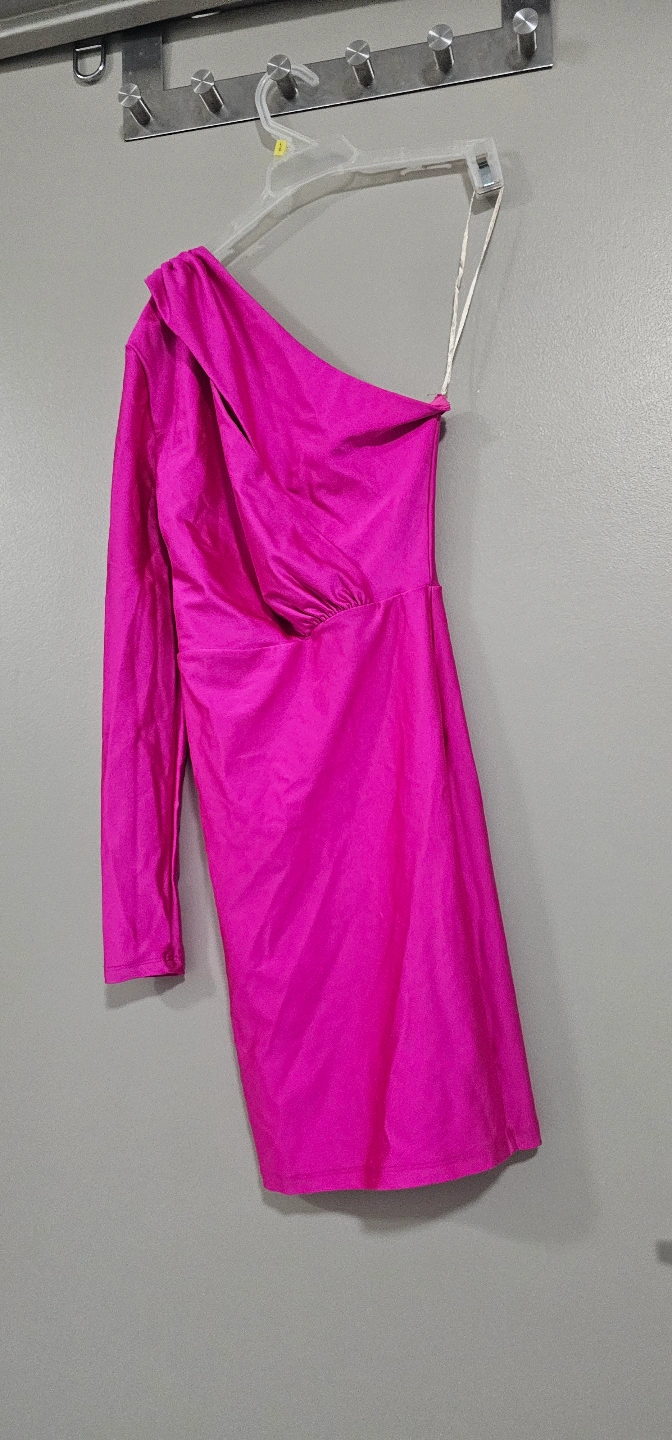 One-shoulder dress in a vibrant hot pink hue. Features a long sleeve on one side. Gathering detail on the waist. Perfect for a fun night out, you might say.