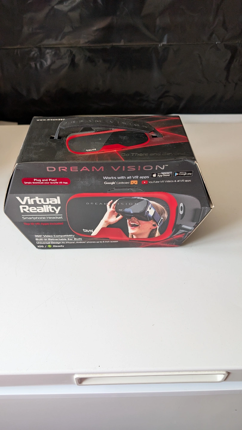 Virtual reality smartphone headset. Has retractable ear buds. Compatible with many apps. For a cozy experience, this headset helps create a relaxing environment.