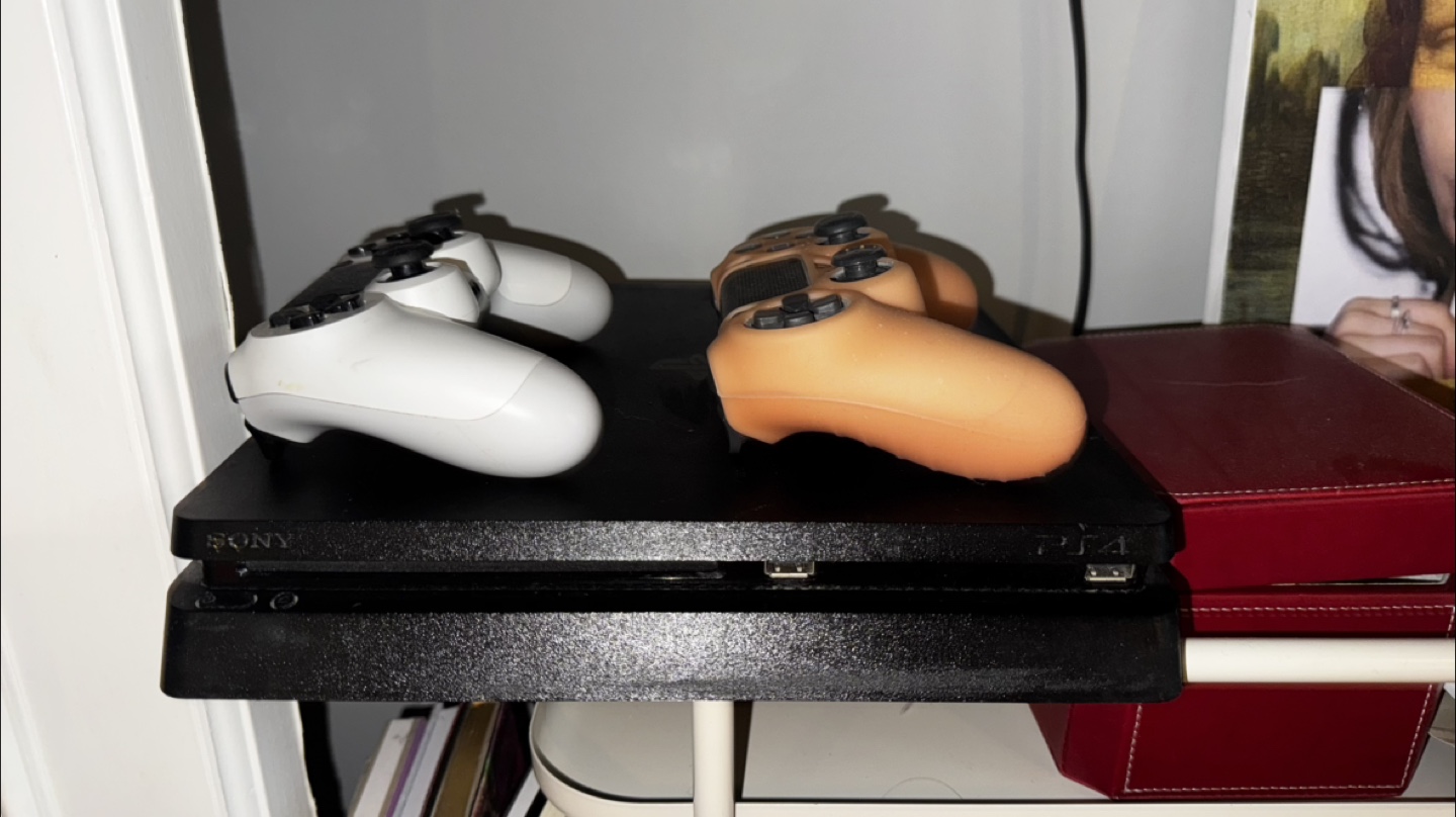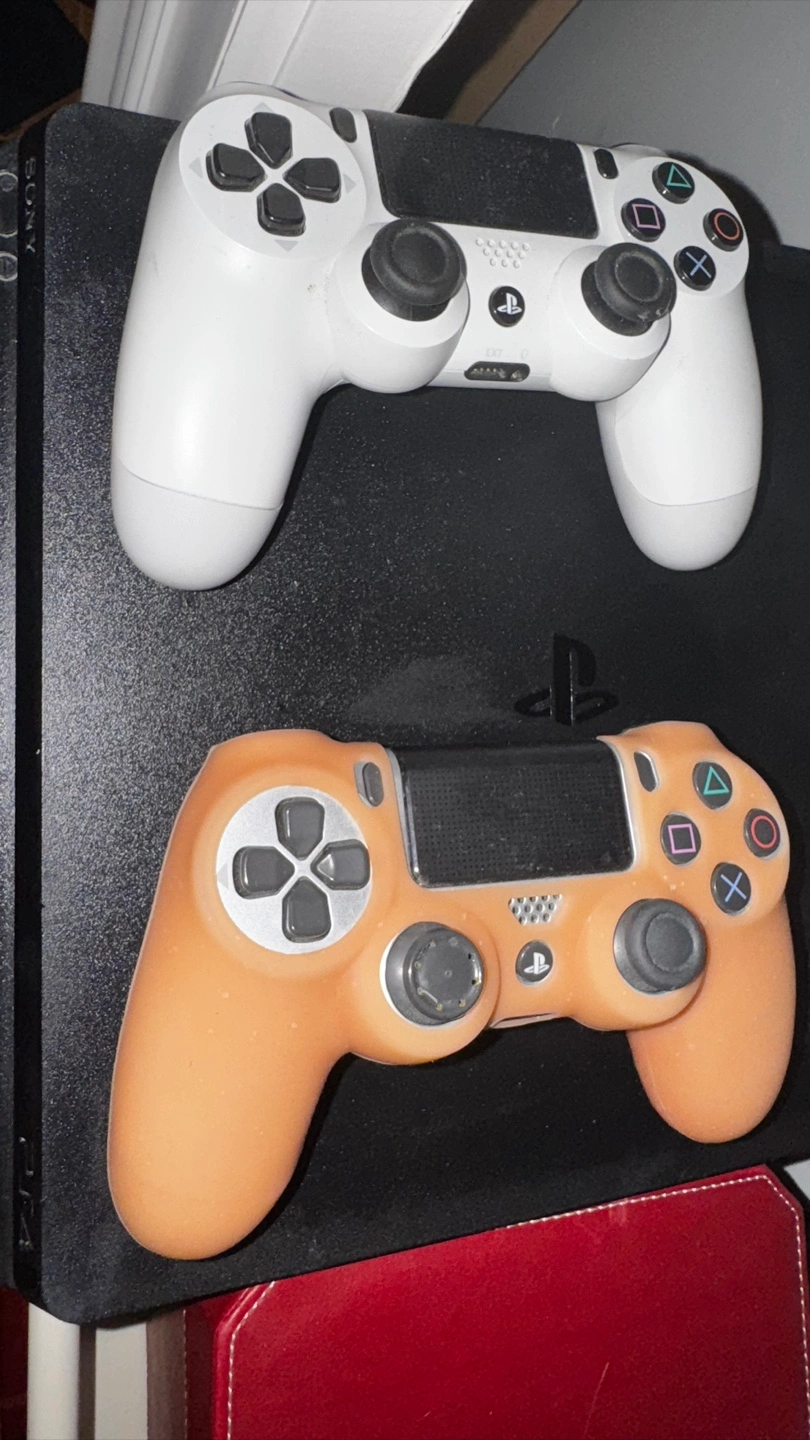 Black console, controllers. One white, one white with orange sleeve. For entertainment. Consider this as a tool for relaxation after a long day.