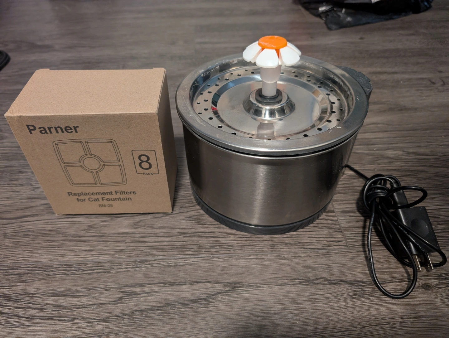 Stainless steel cat fountain, with flower shaped water spout. Includes a box of replacement filters, 4 left.