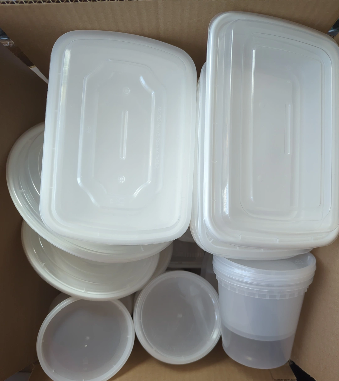 Collection of plastic takeout food containers that were used once and washed. Different shapes. Collected too many.