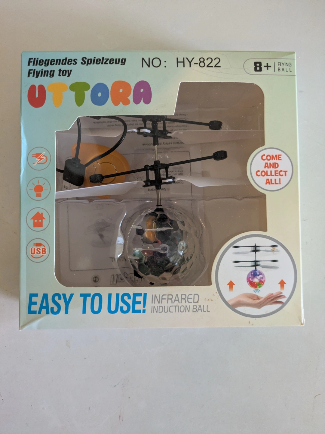 A flying toy with an infrared induction ball, perfect for a relaxing playtime. Lights turn on, and the drone begins to spin. Suitable for age 8+. Quick reply.