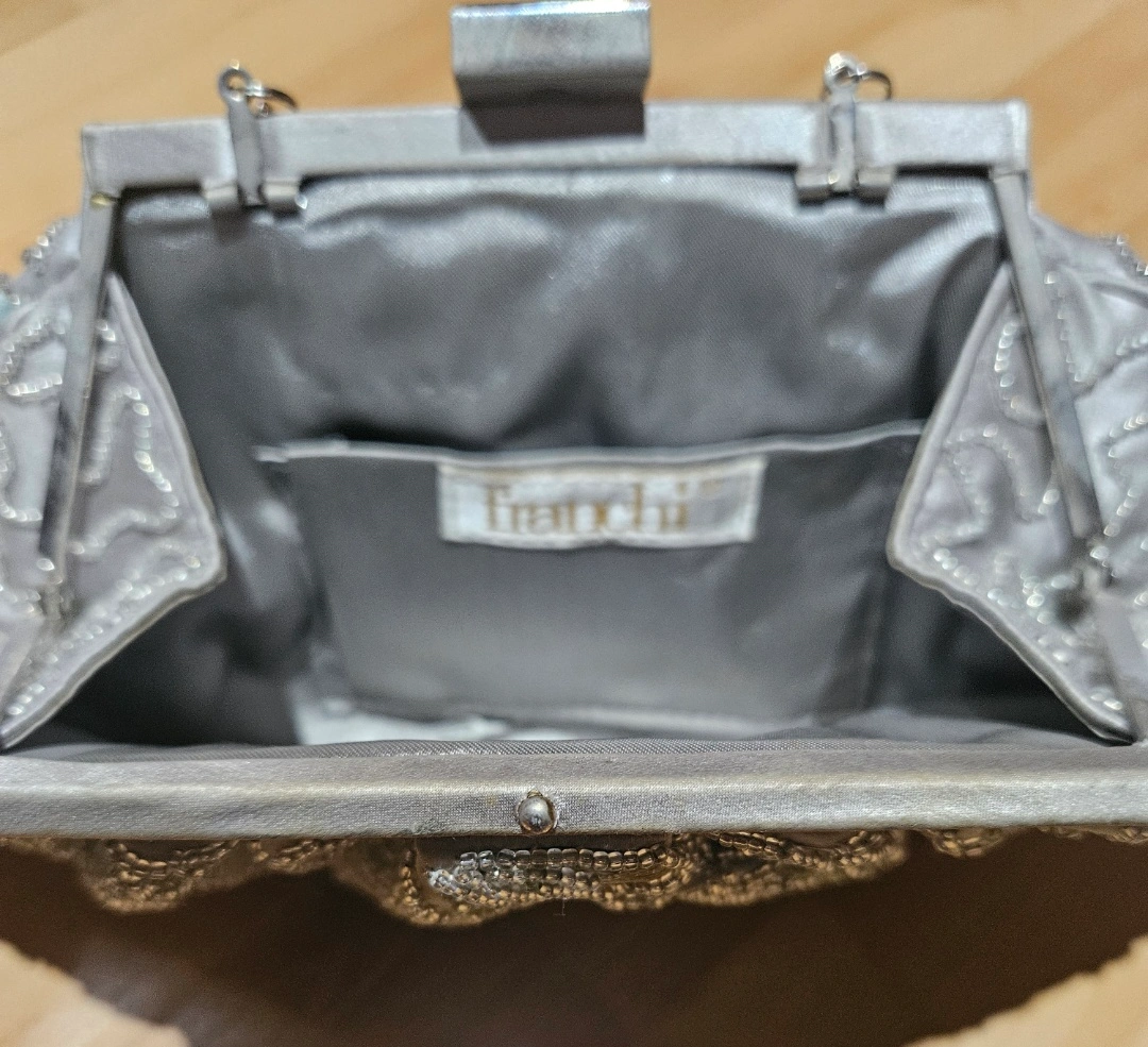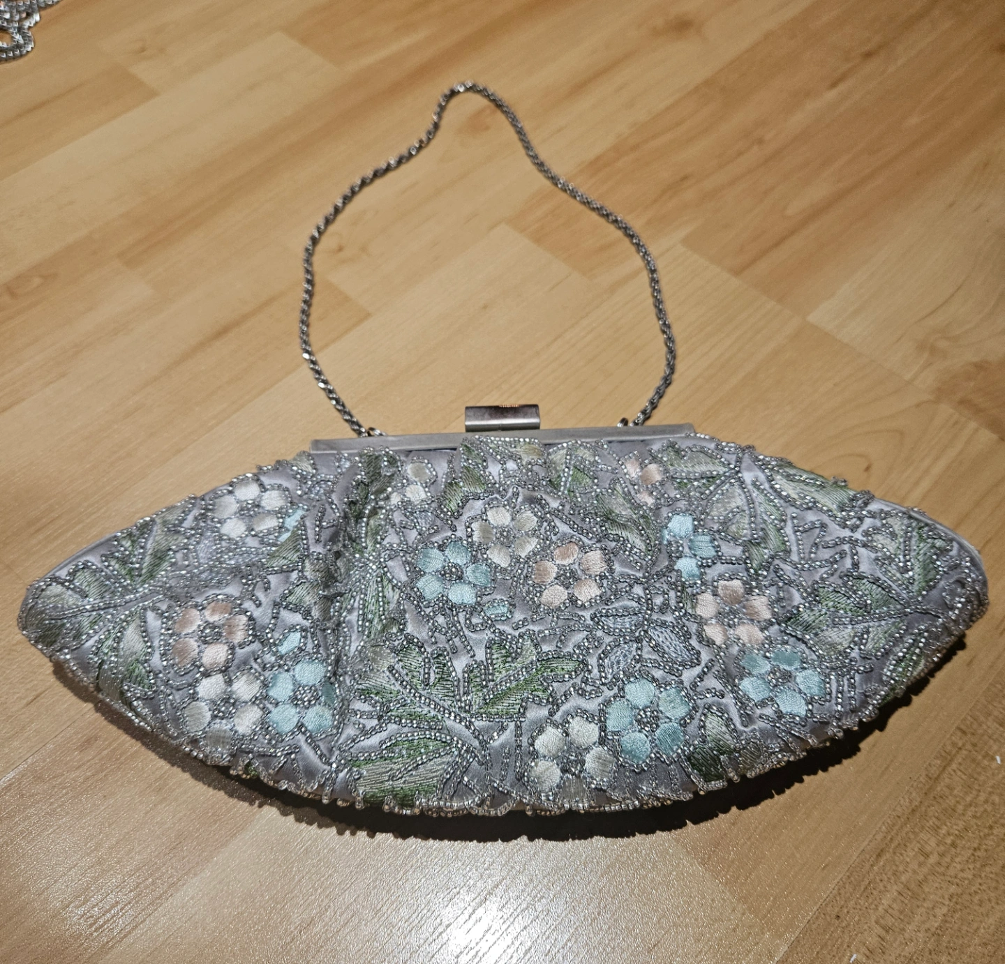Silver clutch with floral embroidery. Features a chain strap. The interior has a pocket, perfect for small essentials, and offers a safe place to keep your belongings.