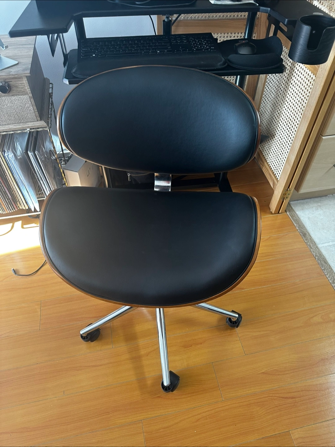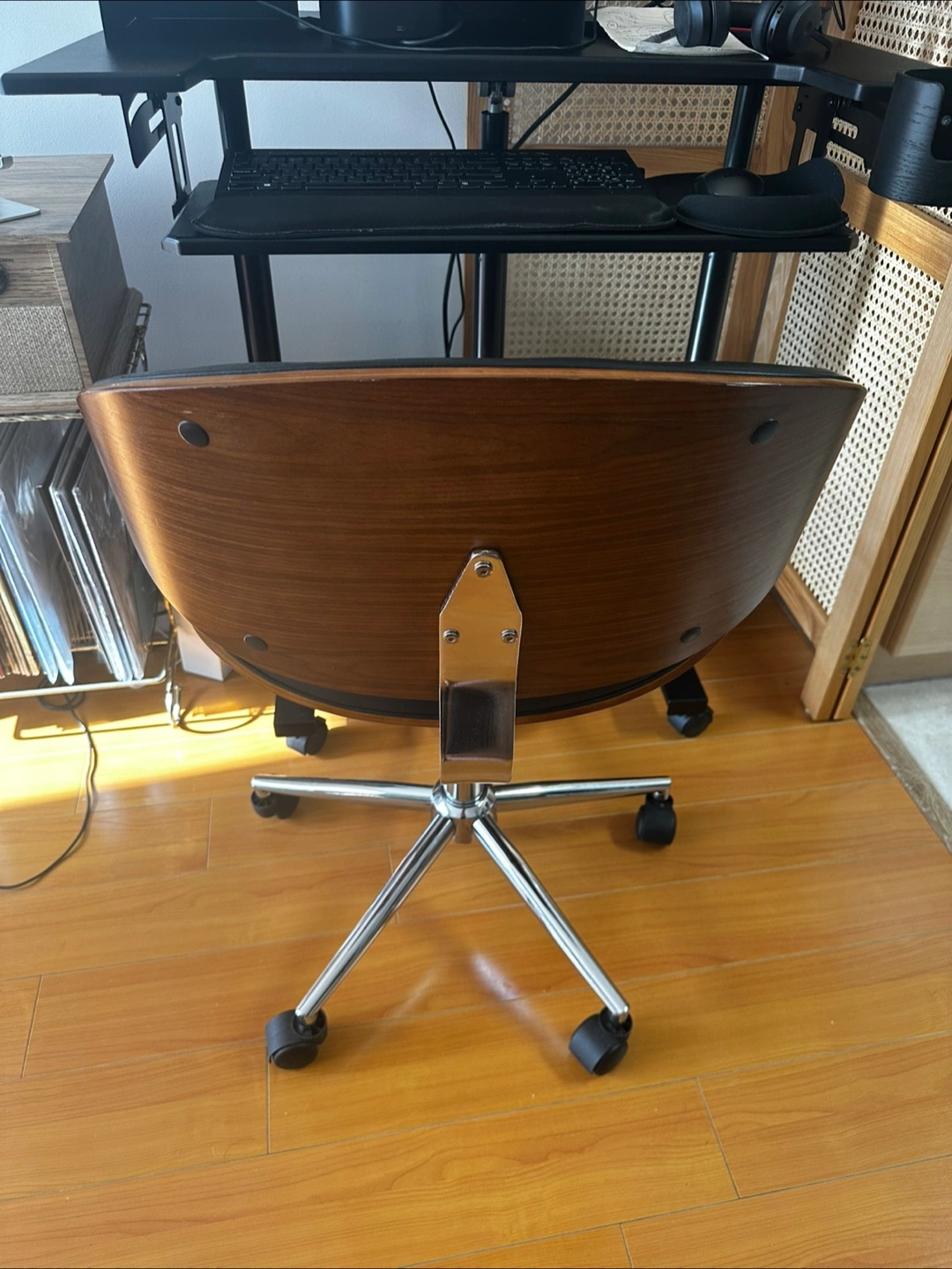 Office chair with wooden details. Features a chrome base with wheels. Would be a great addition to your home for a relaxing reading space.