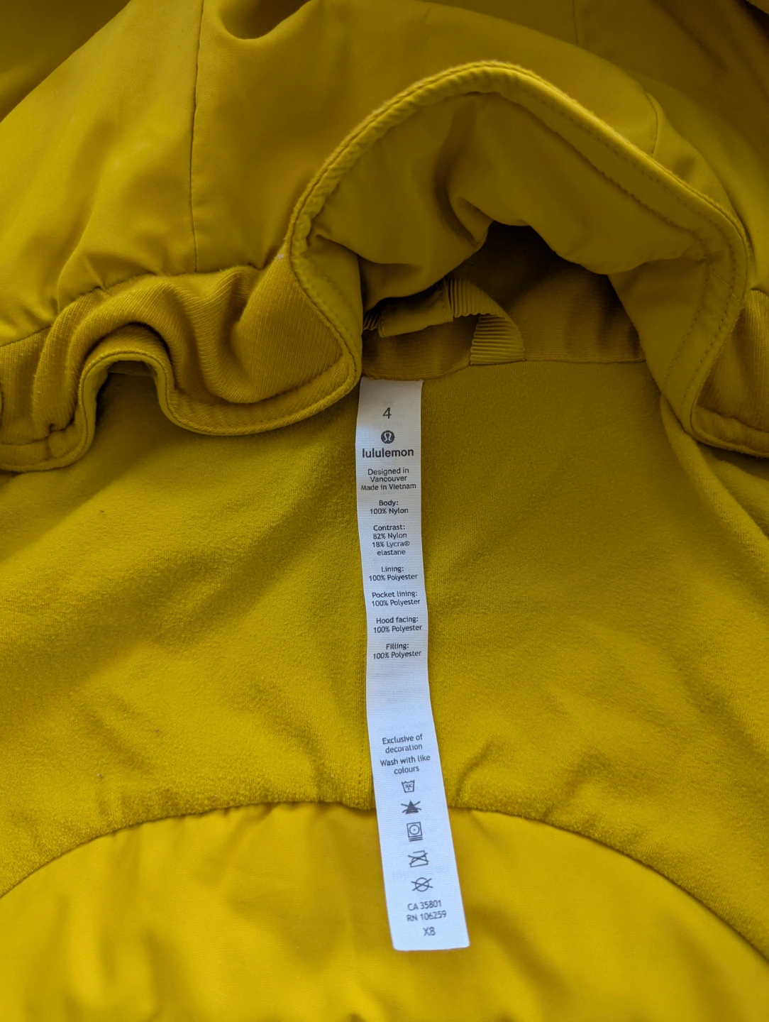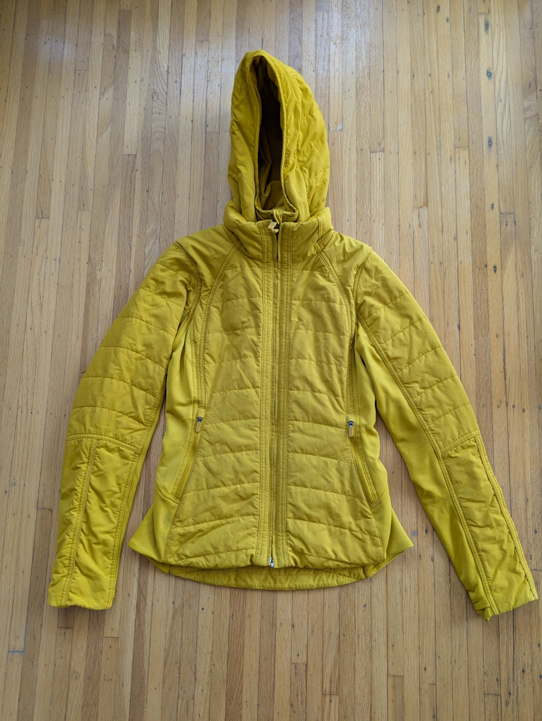 Lululemon “Running another mile” yellow puffer jacket with detachable hood. Great condition. Water-repellent, Windproof, PrimaLoft® insulation is warm, even when wet