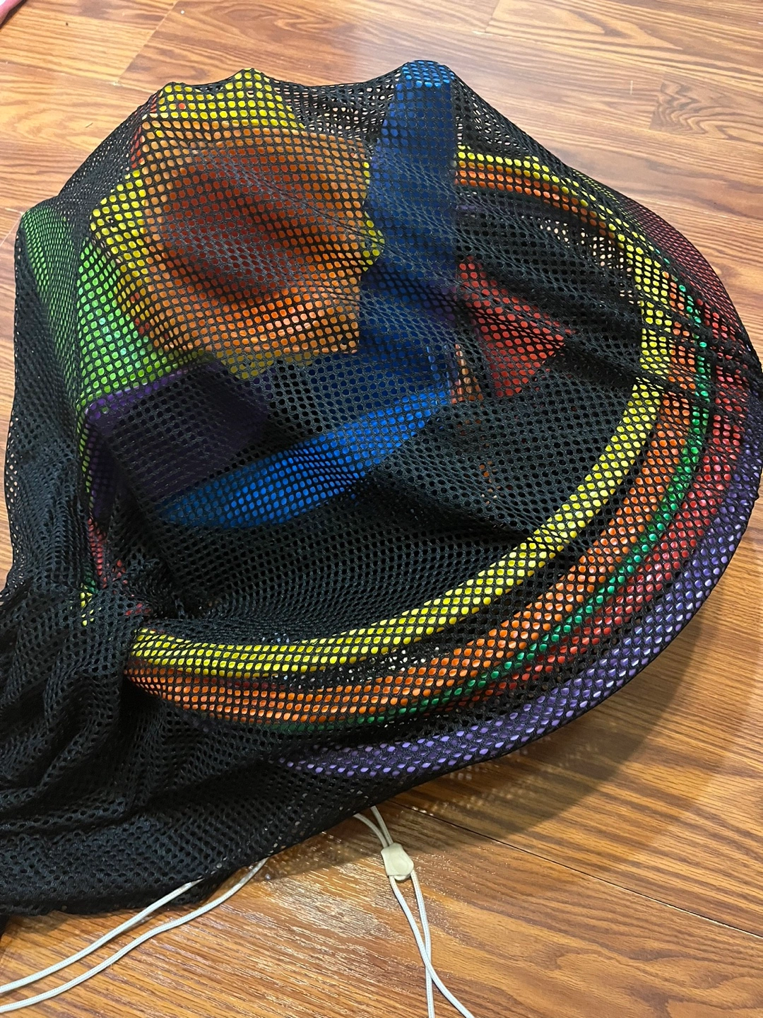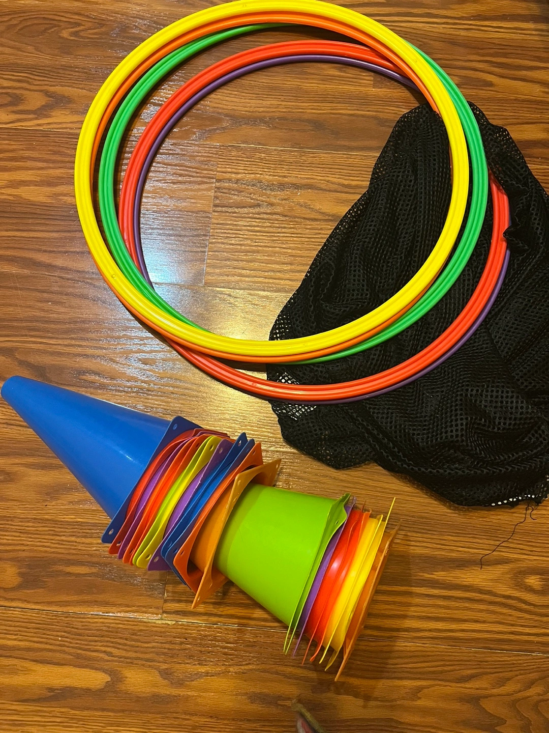 Play set containing colorful hoops and cones. A mesh bag included to store the items. Cones are in multiple colors. A great set for some outdoor fun.