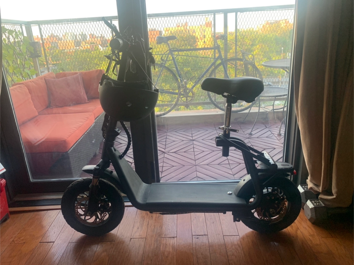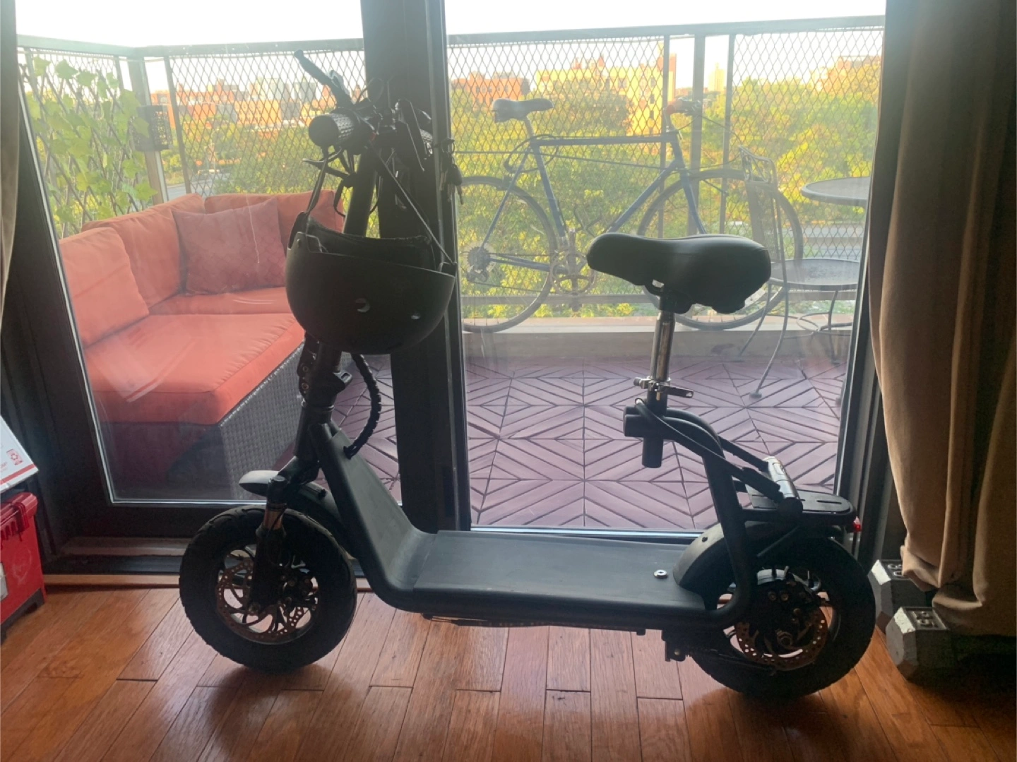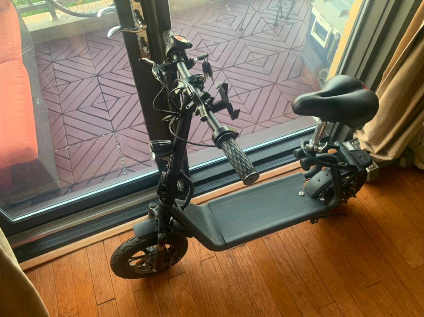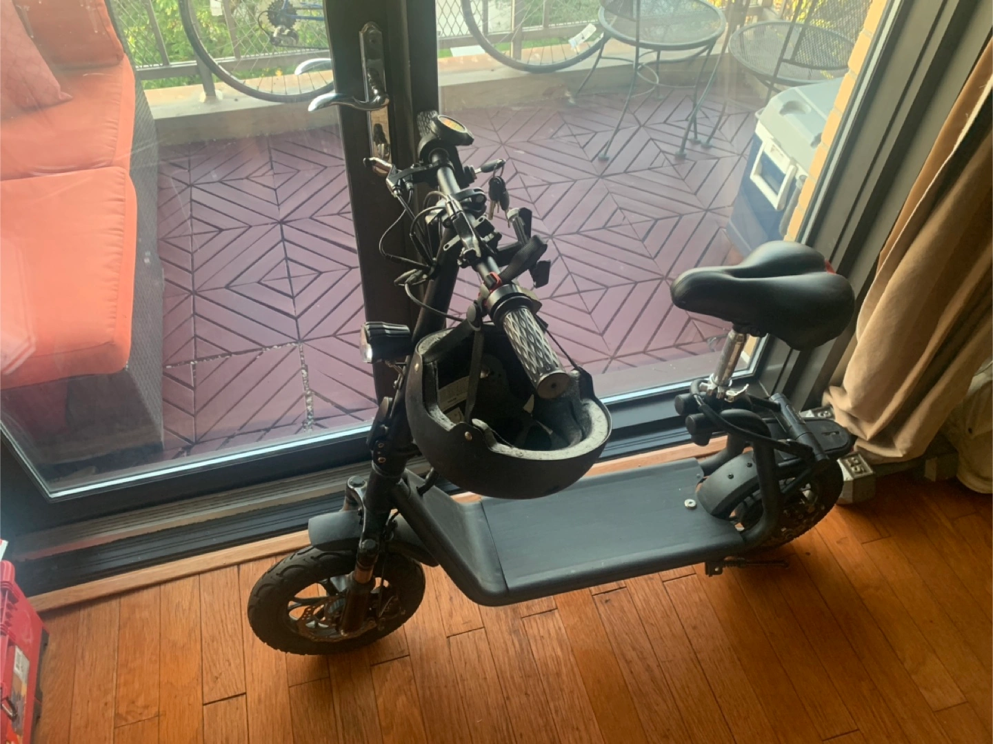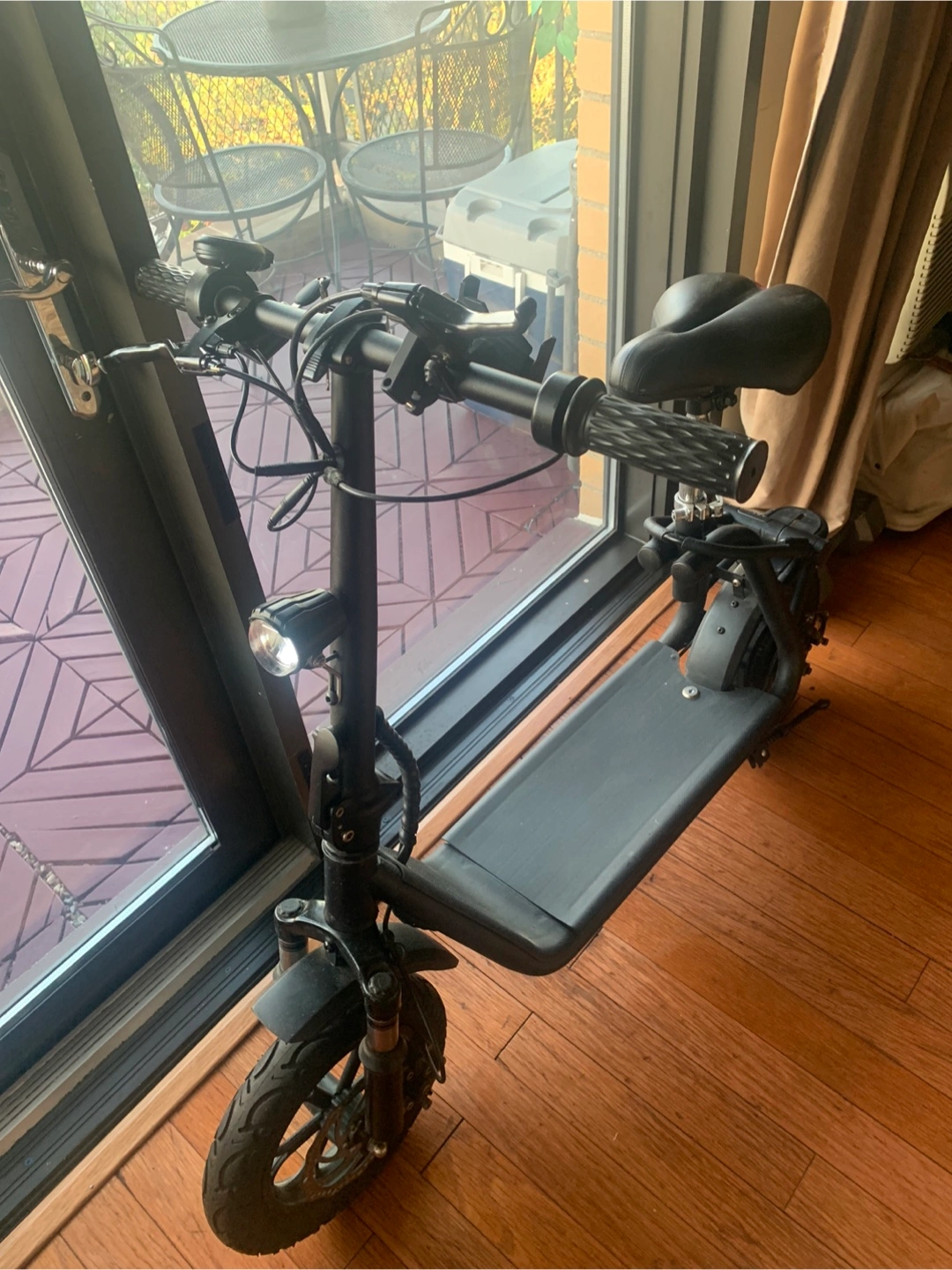 Black electric scooter with built-in seat and run-flat wheels. Perfect way to get around on a sunny day. Good for food delivery or leisure. NEEDS NEW BATTERY, does not run but can be fixed. Sold as-is.