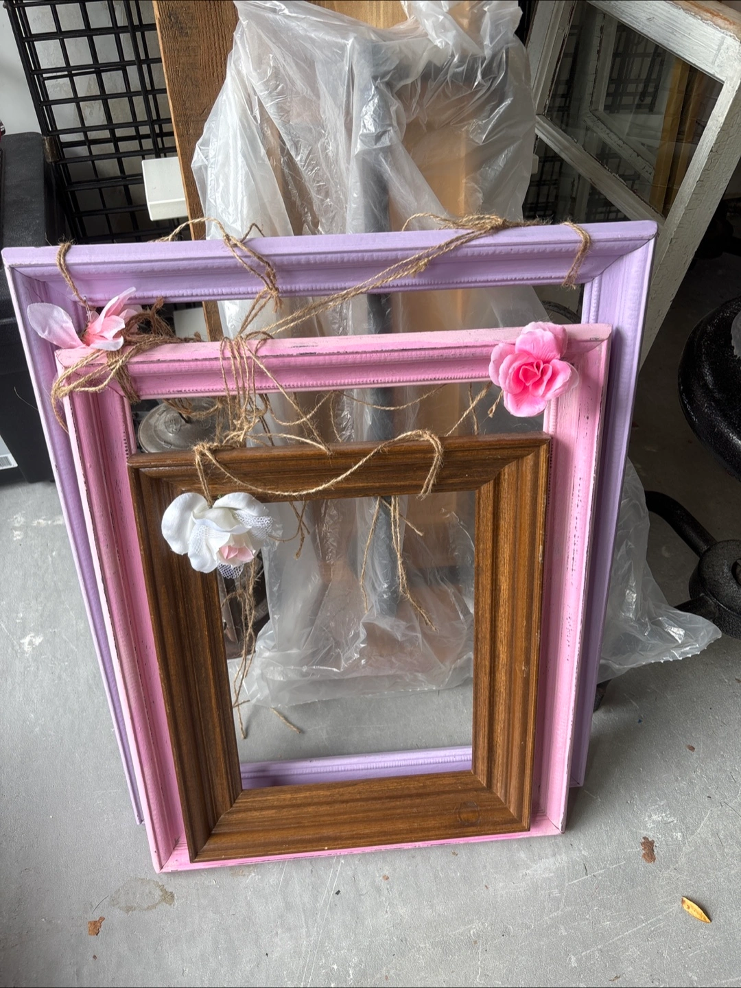 Frames in a set. Each frame in a different colour. Decorated with flowers and twine. Can be used to add a personal touch to any room, creating a calming and aesthetically pleasing environment. 15 for all. Located in Bolton