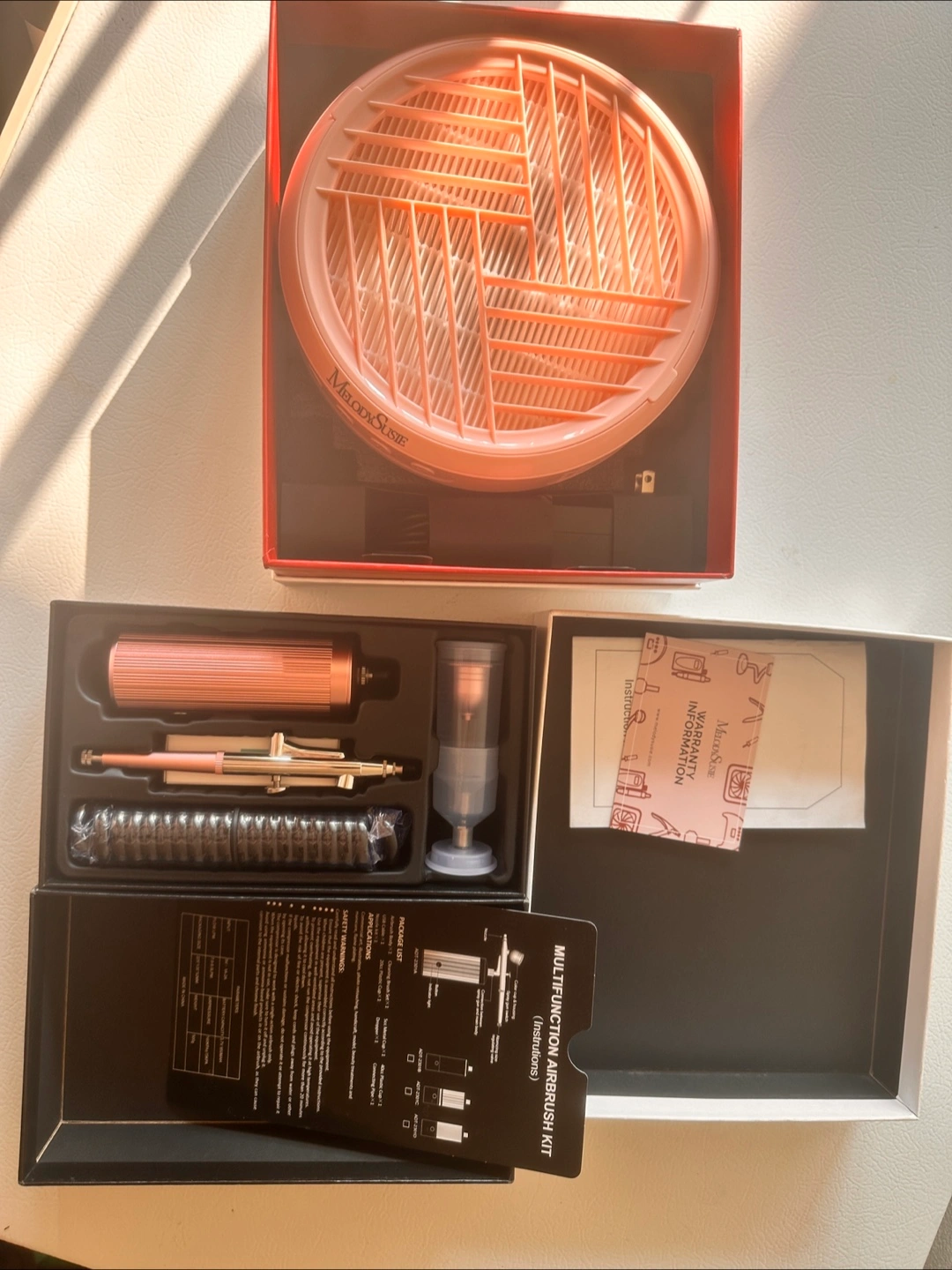 A multifunction airbrush kit. Includes a portable, rechargeable airbrush. It is ideal for anyone looking to create a relaxing at-home spa experience. Also selling with a dust fan.