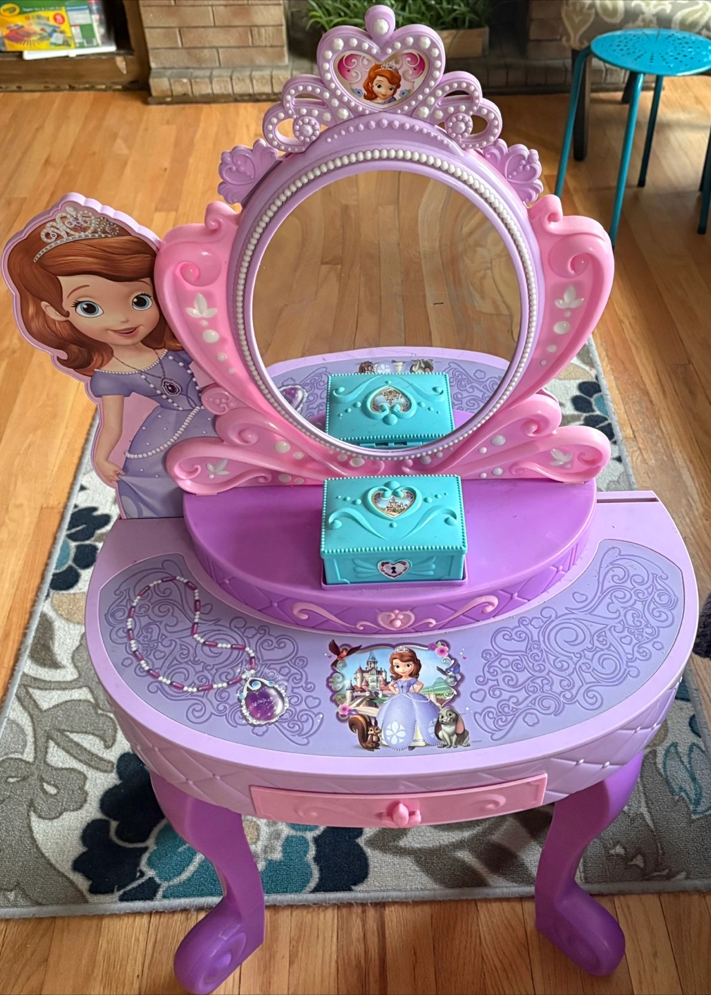 Used lovely purple and pink vanity set. Features a mirror and a drawer and jewelry box. The bird and the squirrel on top can be pushed down or have them showing as you can see in the pictures. I believe it also makes sounds but no batteries . Small minor scratches on the mirror but overall in good condition and very cute , perfect piece for inspiring creative play.
