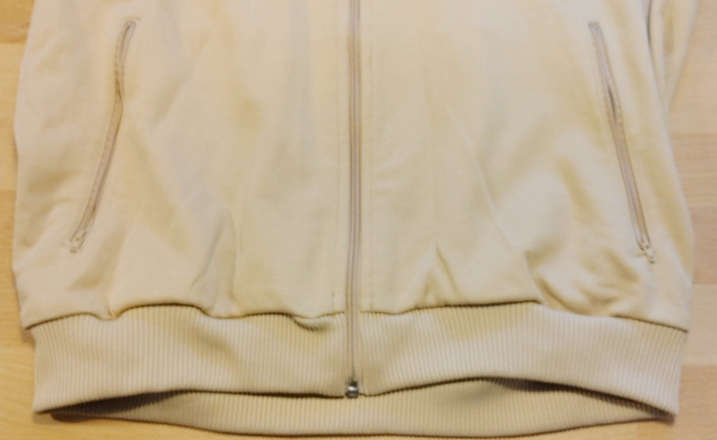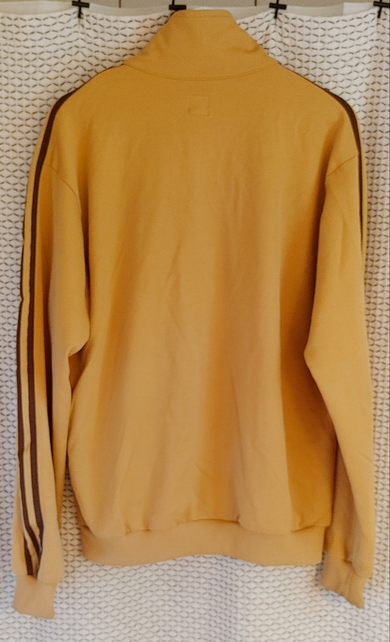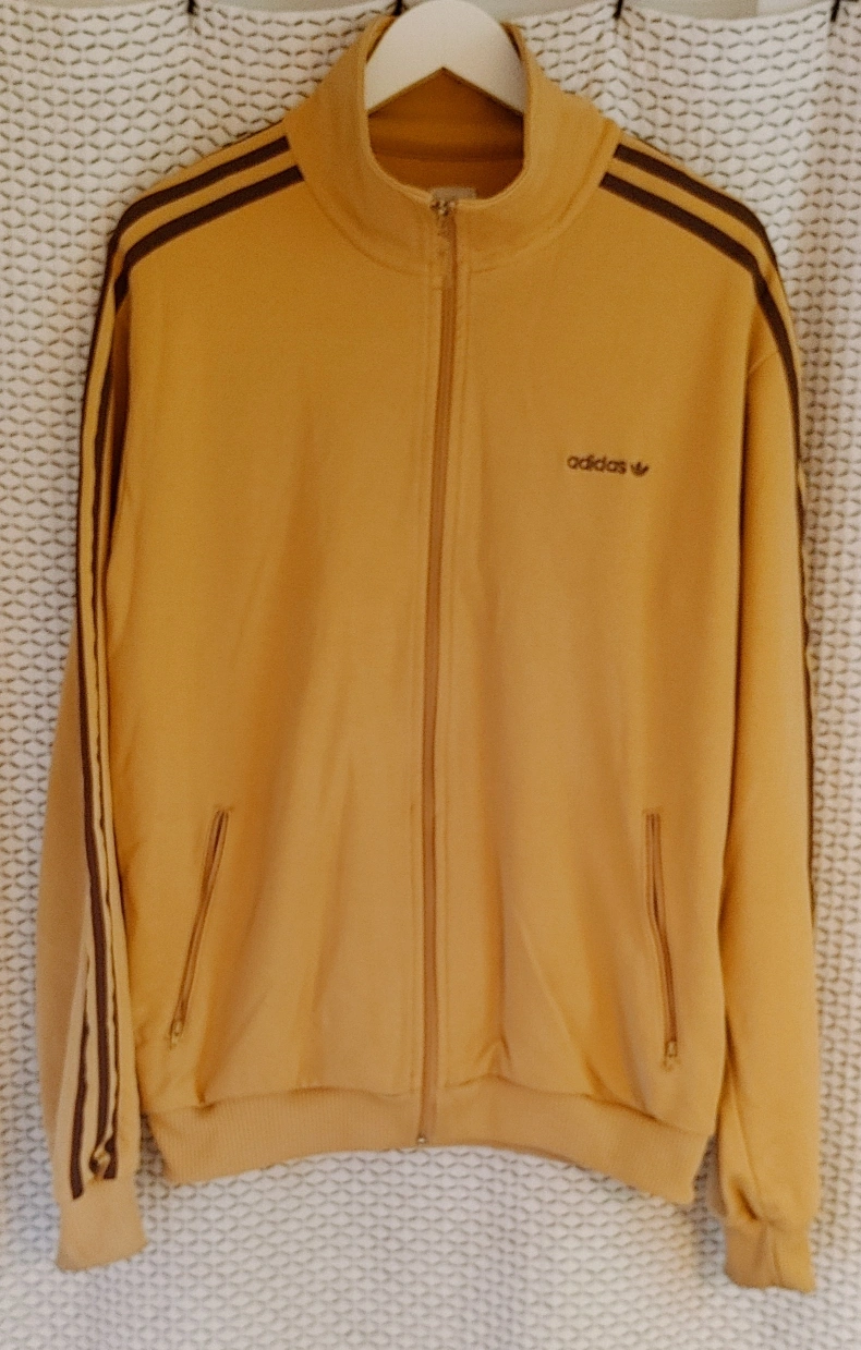 Men's beige Adidas zippered track suit jacket with striped sleeves. Zip up closure and two front pockets. Jacket in good condition. No rips or fraying. Smoke free home pick up Mt.Brydges cash only.