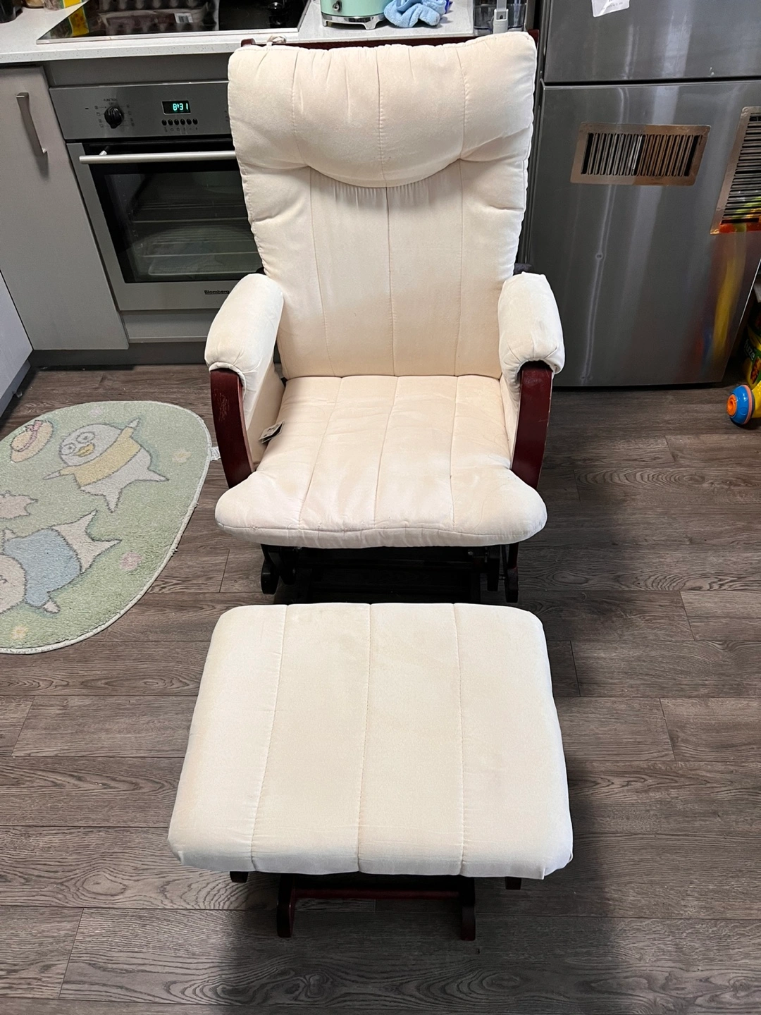 Glider chair with matching ottoman. Features a padded back and arms. The chair and ottoman are cream coloured. Dark wood rocking base. A great place to unwind after a long day.