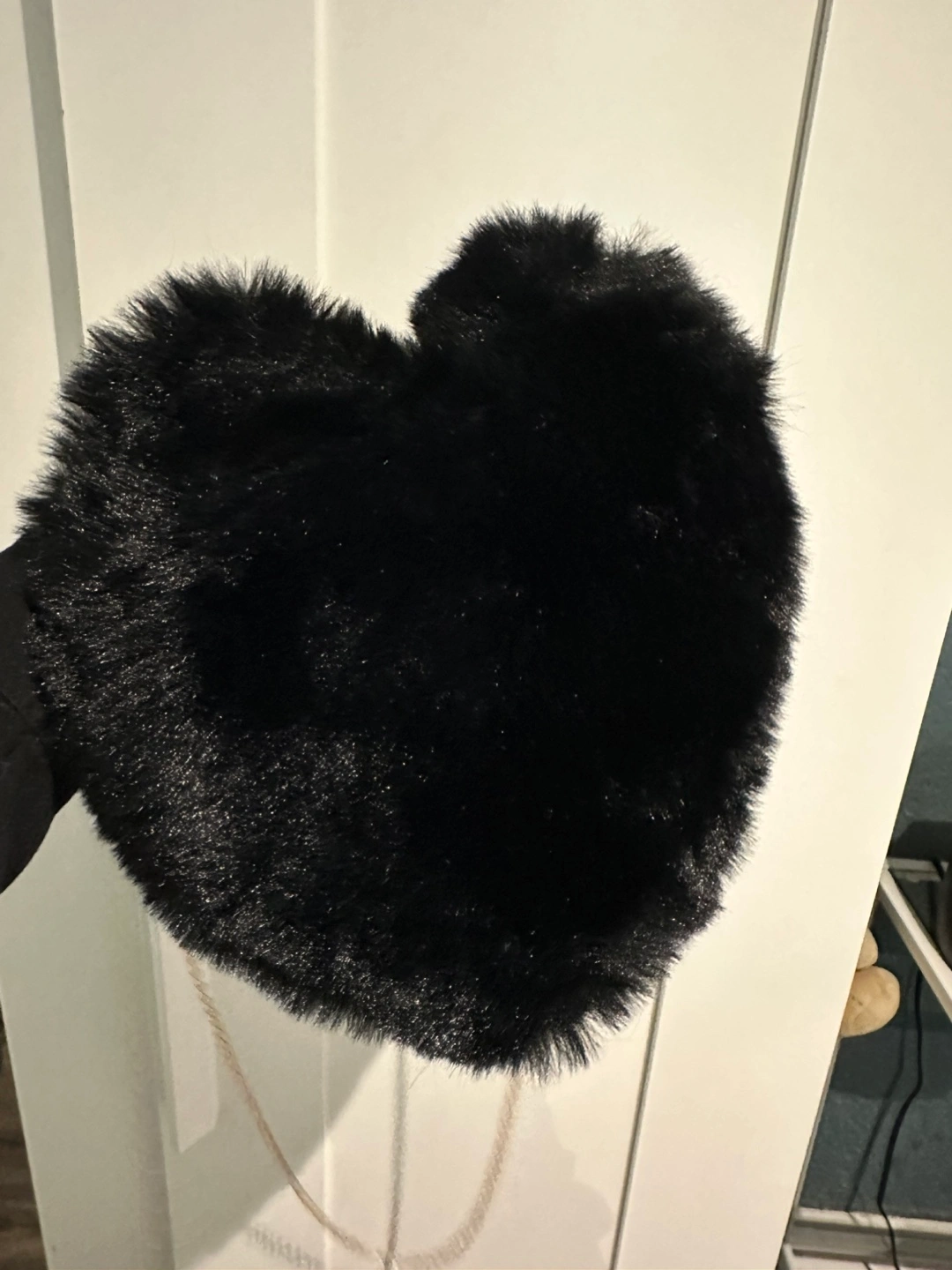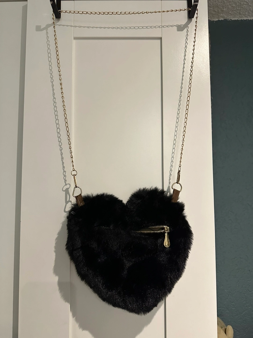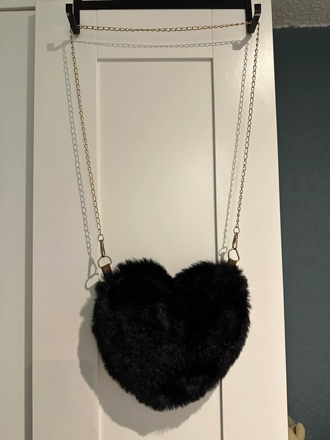 A plush, heart-shaped bag. Features a gold chain strap. A perfect bag for a lovely evening out, or even just for carrying your daily essentials.