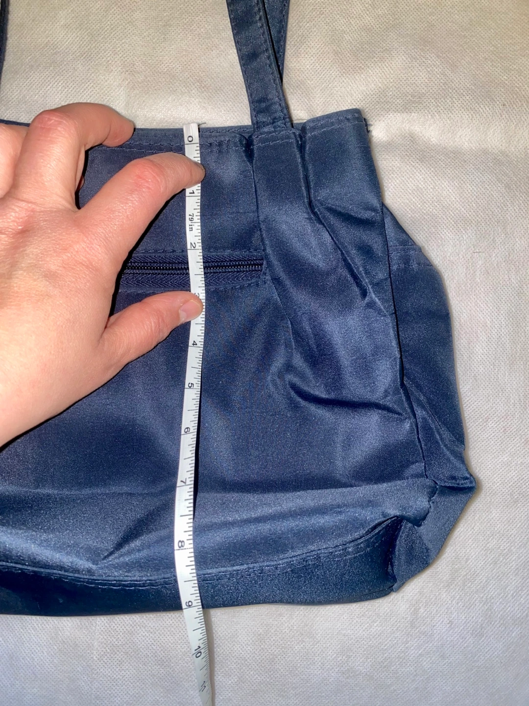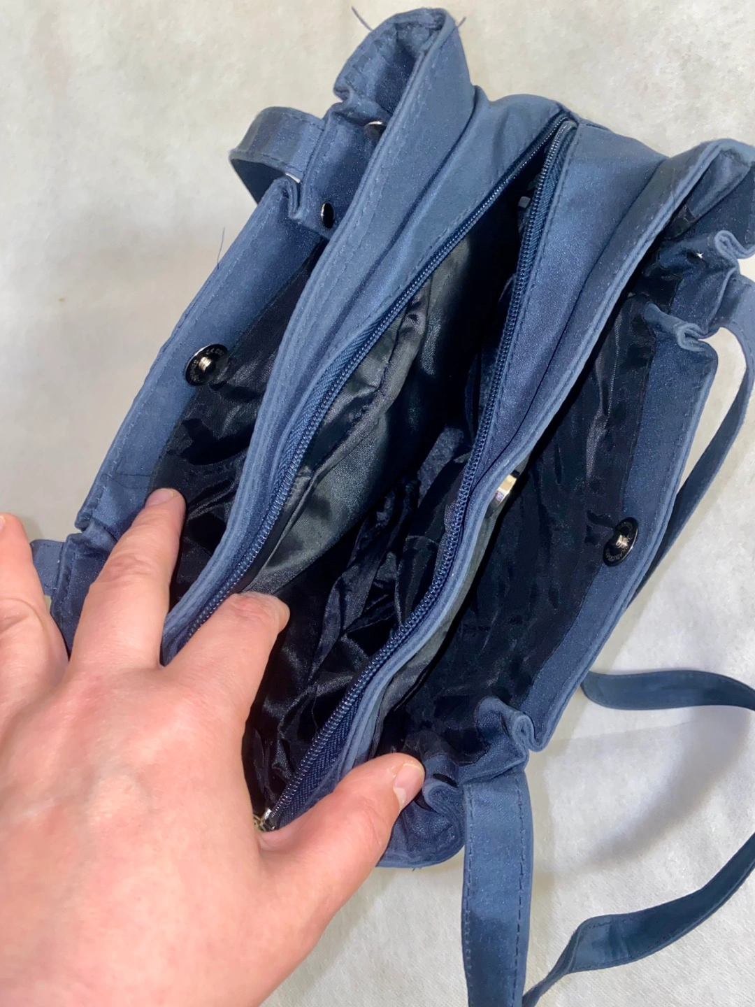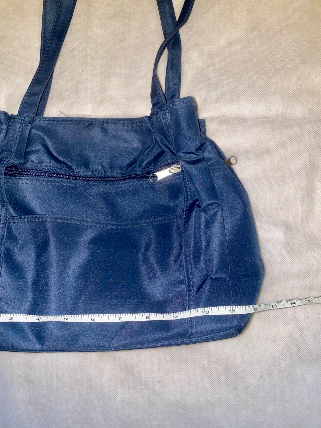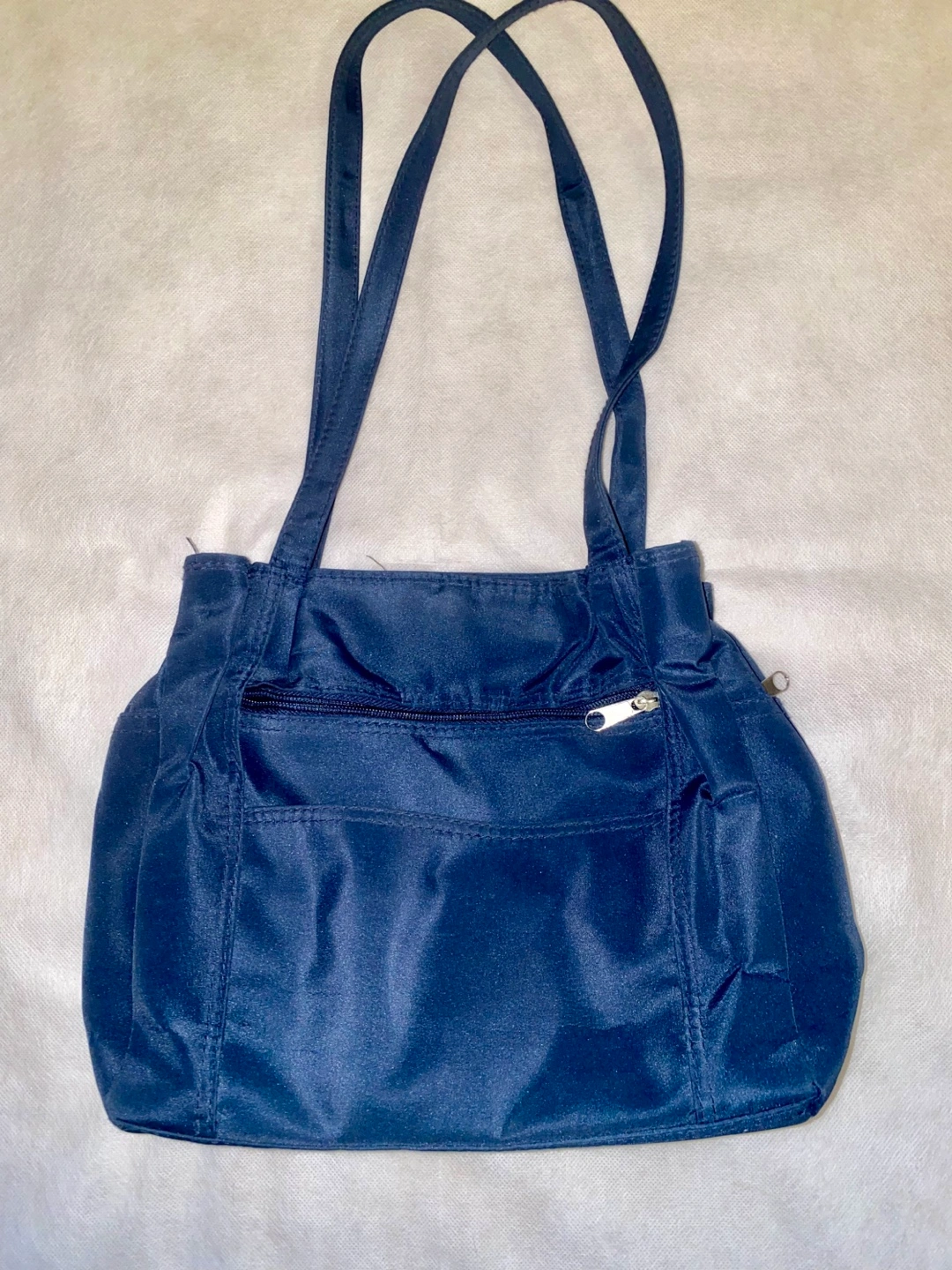 A shoulder bag in a navy blue colour. Features two straps and a zipper on the outside. Perfect for carrying everyday essentials in a relaxed and casual way.