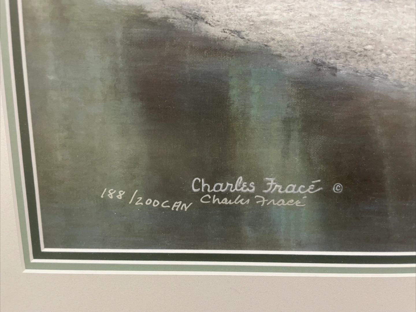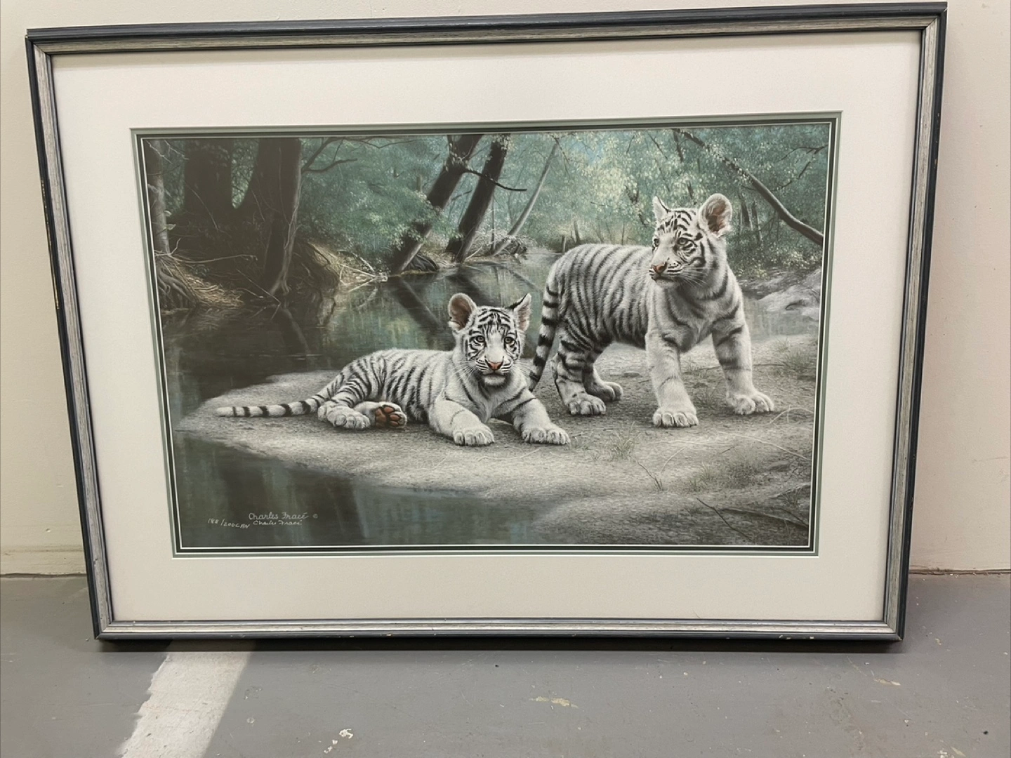Framed numbered and signed Charles Fracé, print titled “Partners” of two white tiger cubs in a forest. To order unframed currently selling for US$325.