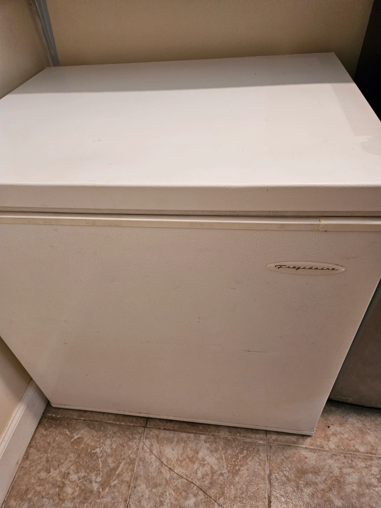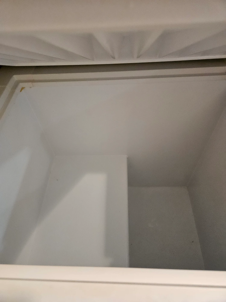 White chest freezer. Rectangular design. Simple top lid. Perfect for safely storing your food for a long time.