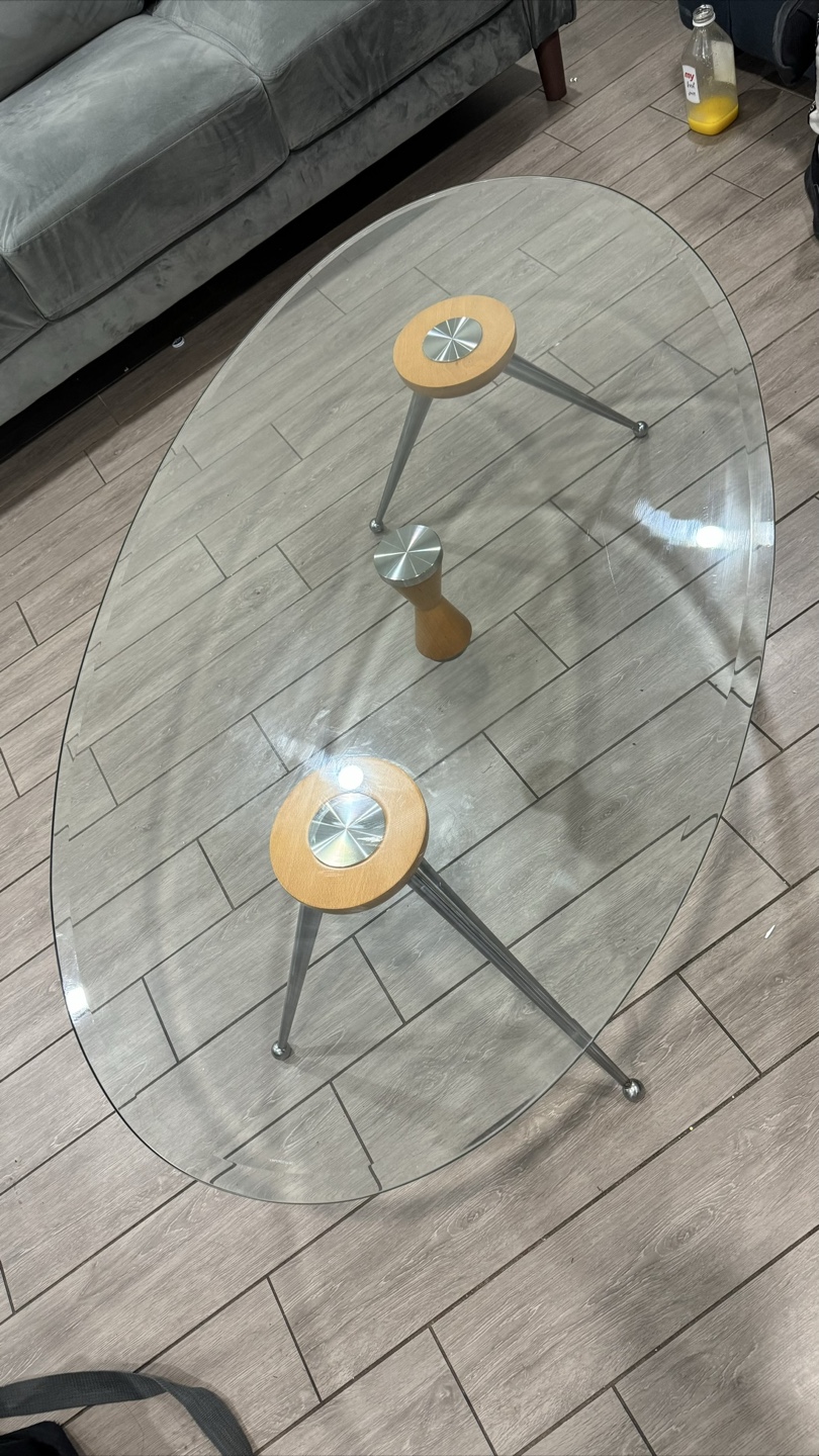 Oval shaped coffee table. Glass top. Metal legs. Features wooden accents. A perfect item for enjoying a nice cup of tea while reading your favourite book. Did not fit in my boyfriends place