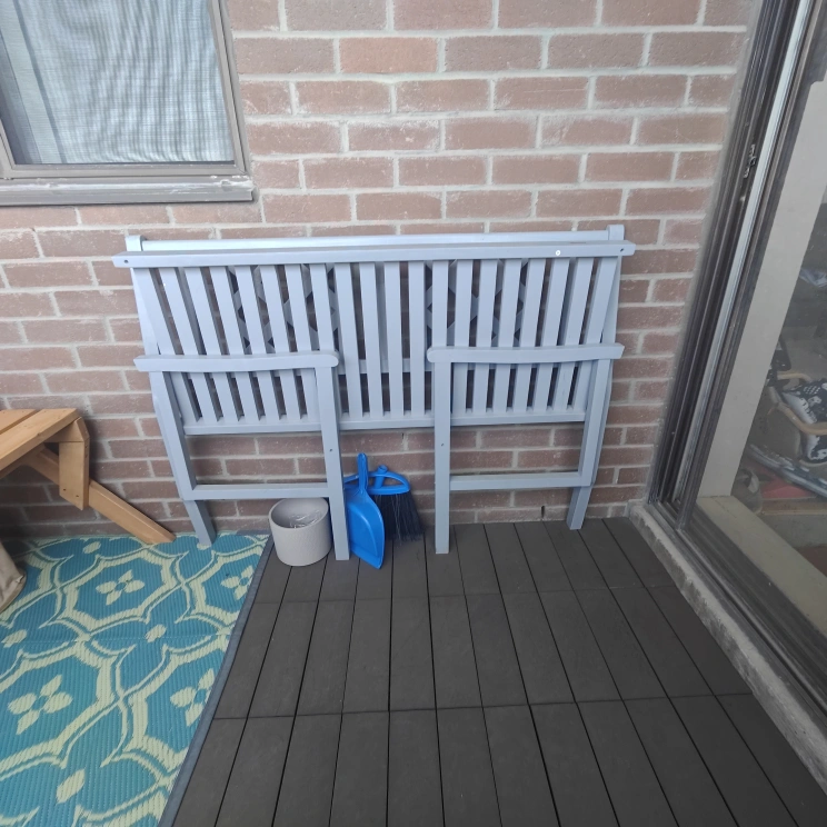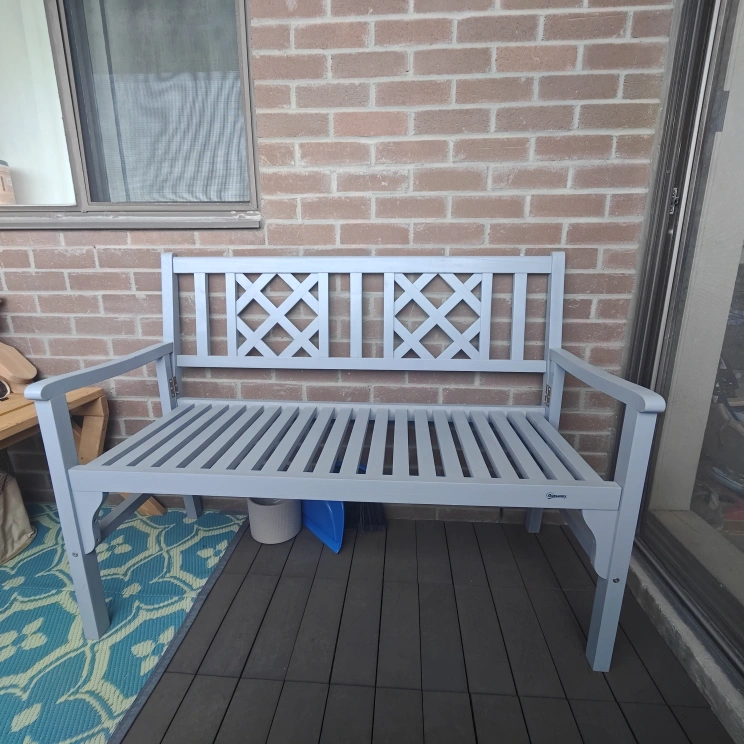 Wooden bench with a gray finish. Features a slatted seat and a backrest with a lattice design. A great way to enjoy the outdoors and relax.