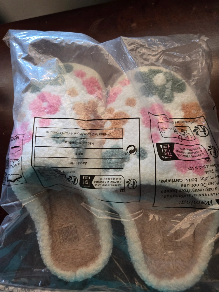 Soft slippers, likely new. White with floral pattern. Lined with soft material. Perfect for relaxing around the house.