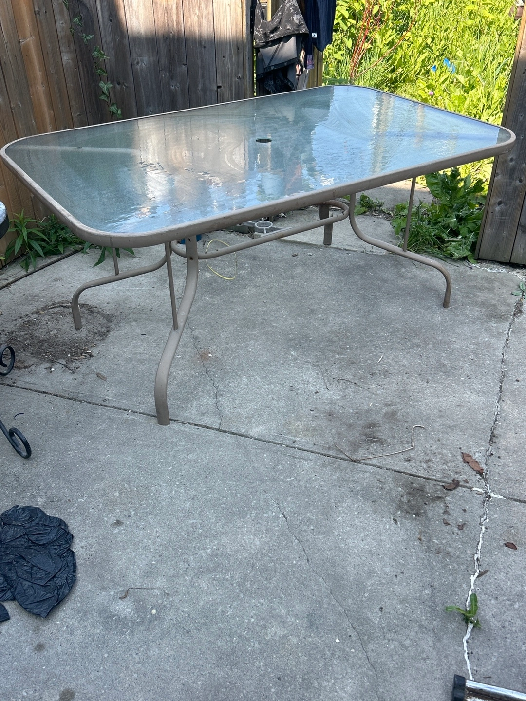 Rectangular patio table. Features a glass tabletop. The frame is made of metal. A perfect spot to enjoy a leisurely brunch with your loved ones.