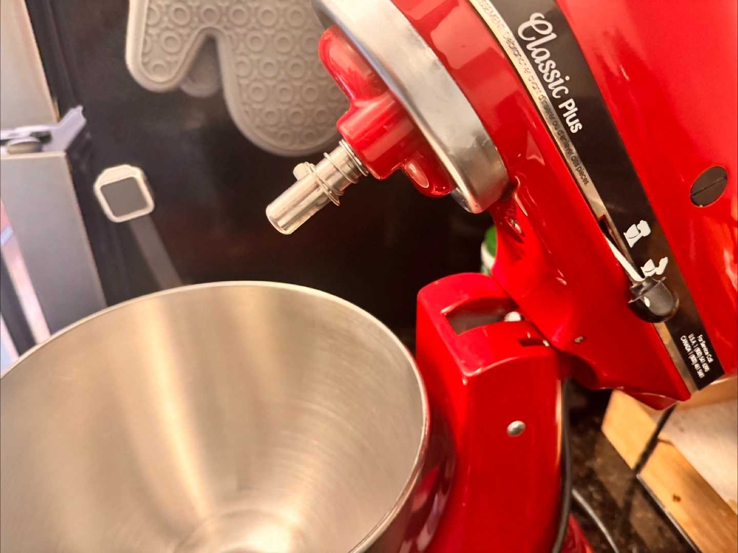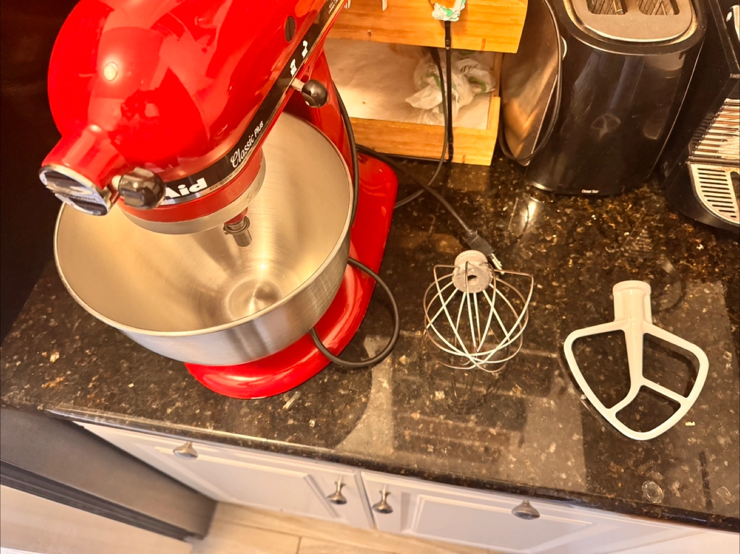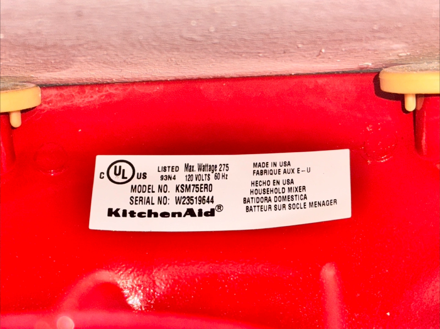 A beautiful red stand mixer. Includes the mixer itself and mixing bowl and 2 accessories.