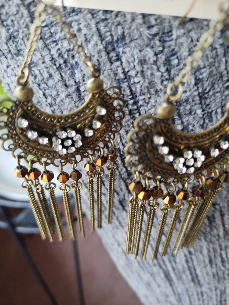 Beautiful, elegant earrings. Featuring an antique gold finish, Zirconia stones, bronze coloured beaded detail, and chains. Perfect for a night out or any occasion.
