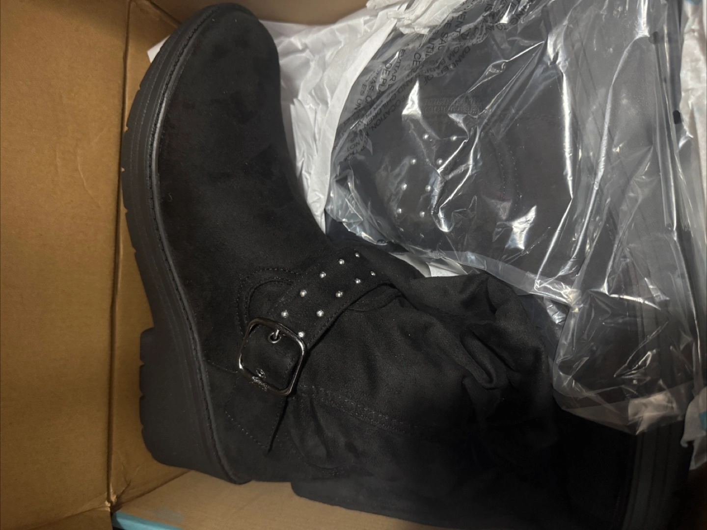 Gorgeous black boots, perfect for any wardrobe. They reach the knees, and feature a studded strap. The boots come with a small buckle and a small wedge heel.