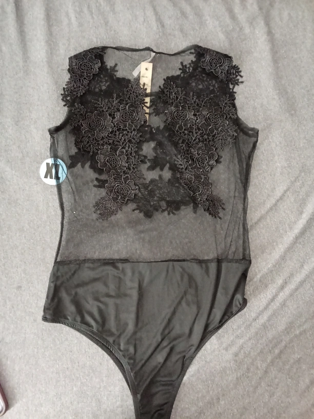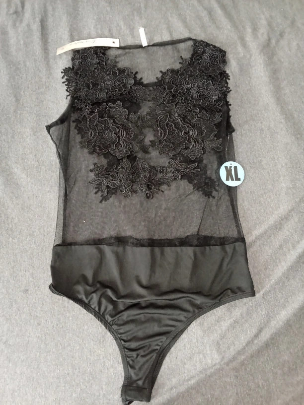 Black bodysuit. Sheer mesh upper section. Detailed floral embroidery around the neckline and chest. Size XL. A great piece for a relaxed evening at home.