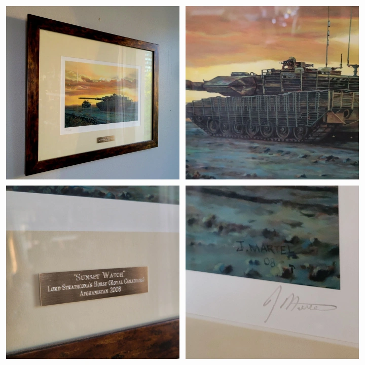 1) Limited edition framed print titled "SUNSET WATCH" by Lord Stratona Hona Ros, created in 2008. It depicts two tanks against a sunset backdrop. The print is numbered 24 out of 200.