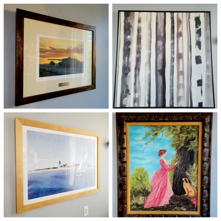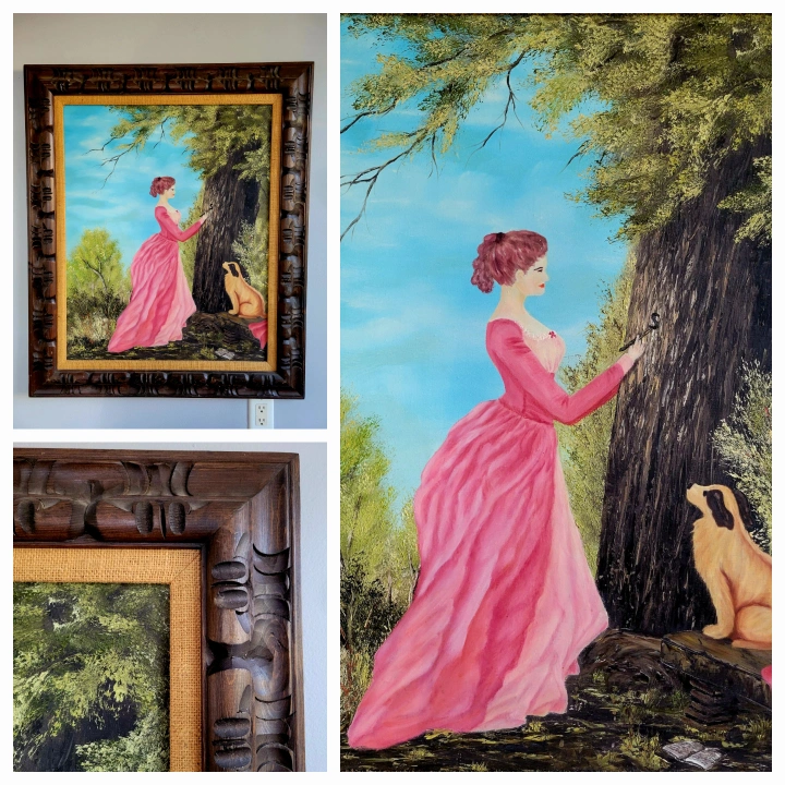 4) Original acrylic painting of a lady and a dog in a heavily carved dark wood frame. So so craftsmanship, great frame.