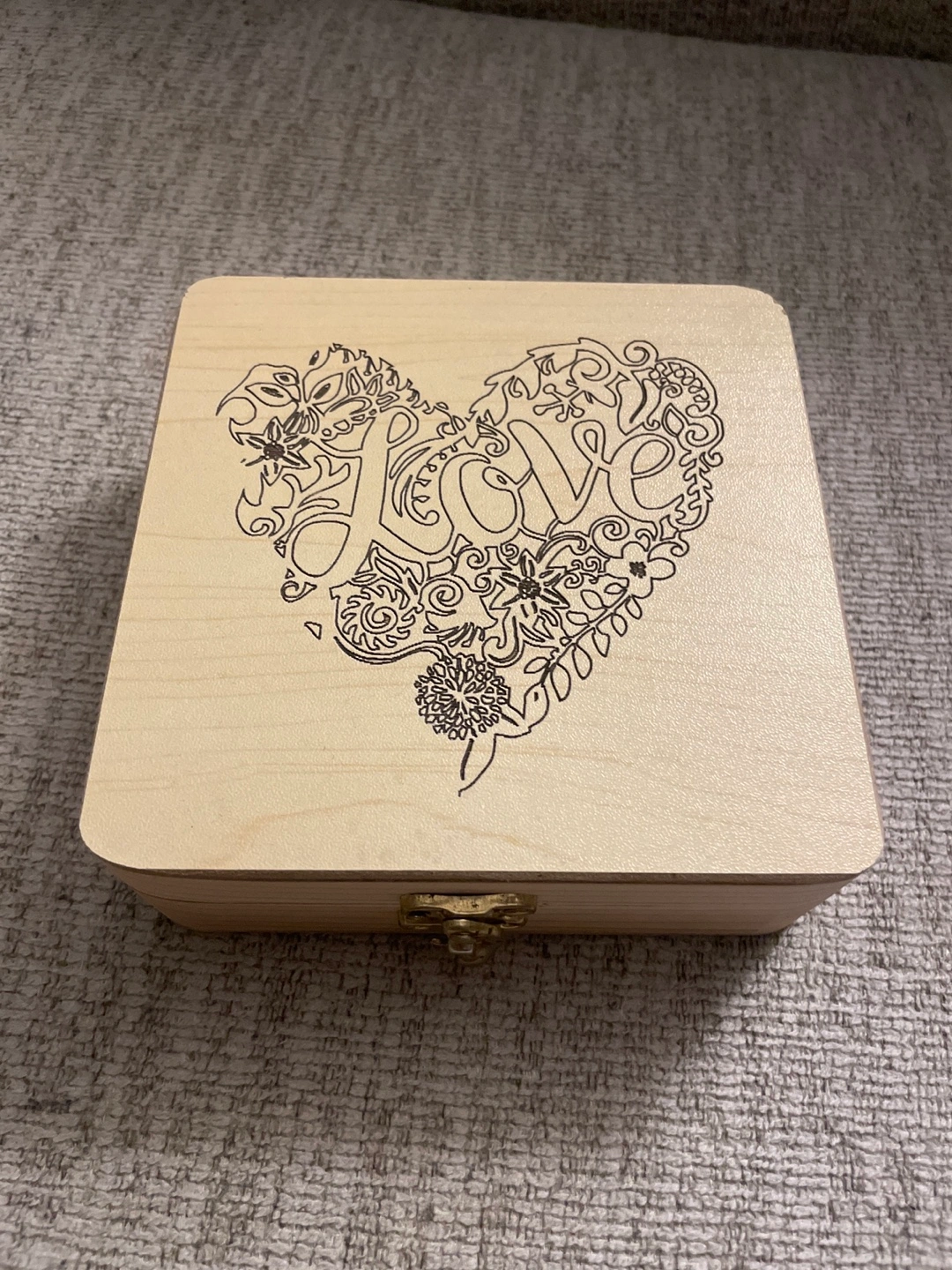 A wooden box with a heart design on the lid.