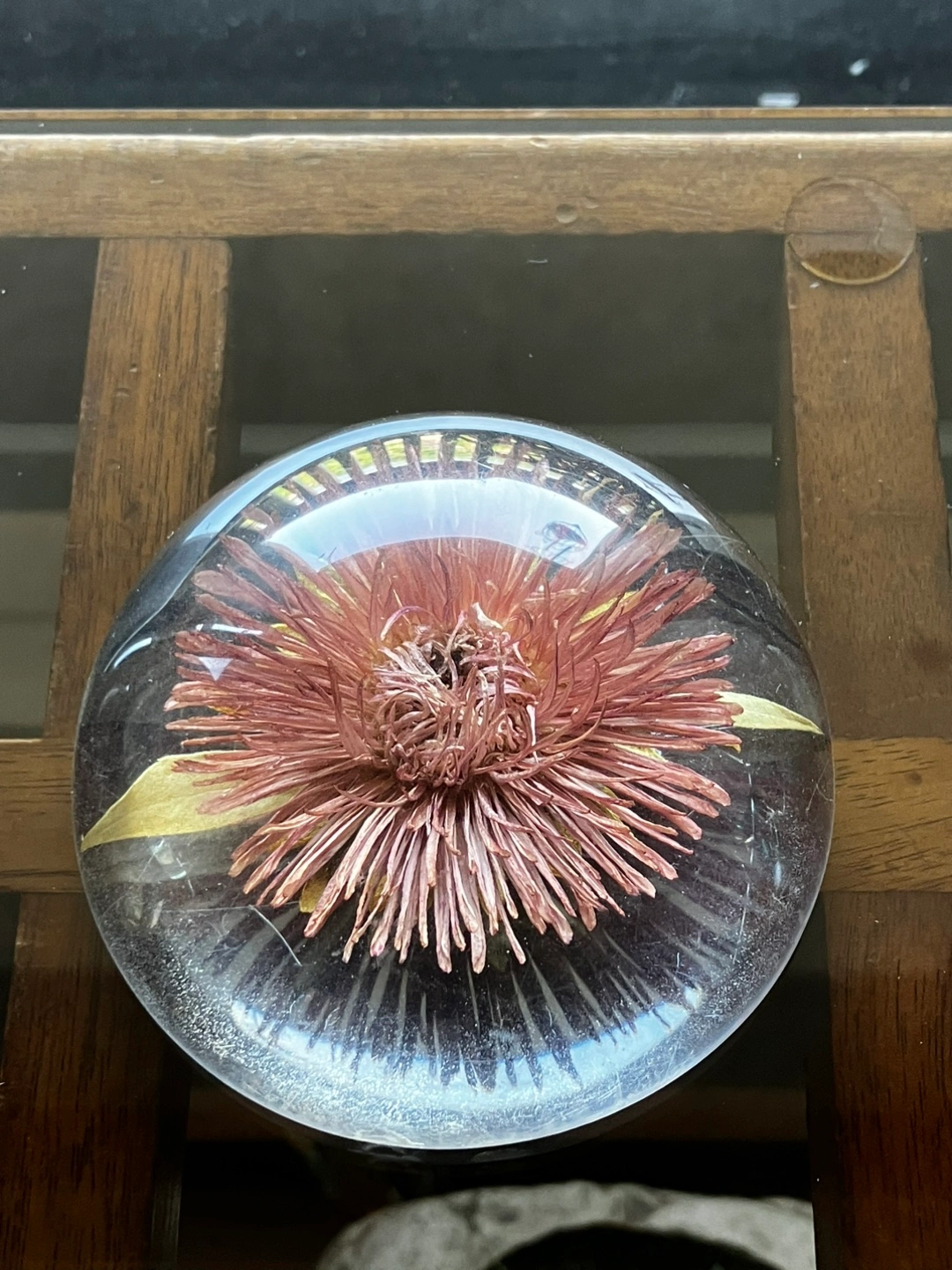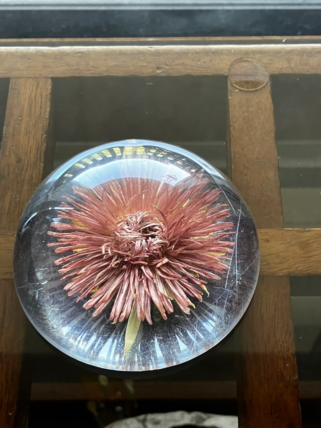 Presse-papier en résine avec fleur rose mesurant 3 3/4” sur 2”. En bon état.