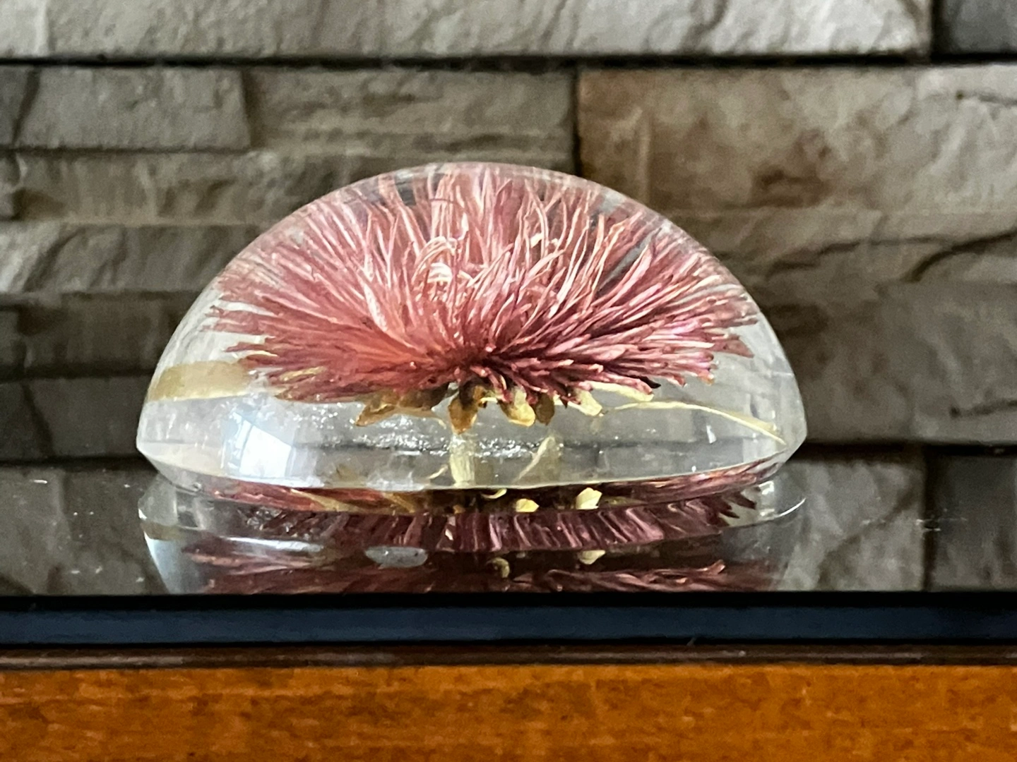 Beautiful vintage paperweight of a flower in acrylic matrix measuring 3 3/4” x 2”. In good condition.