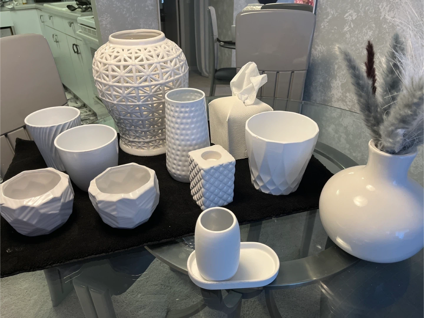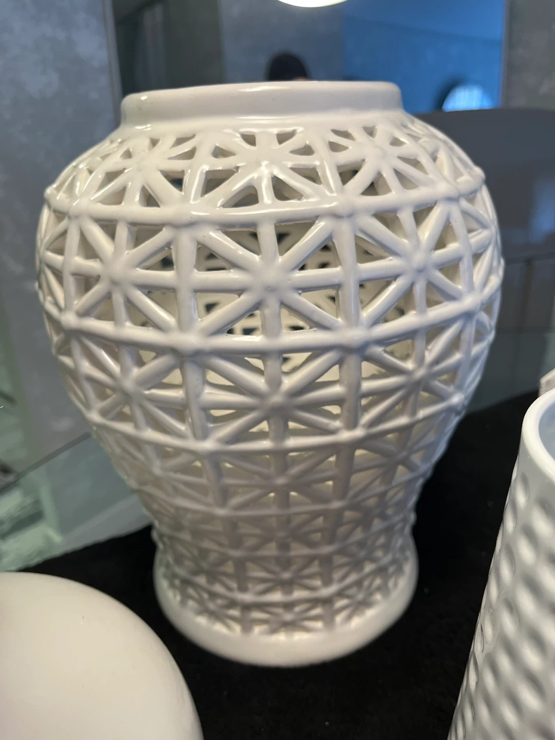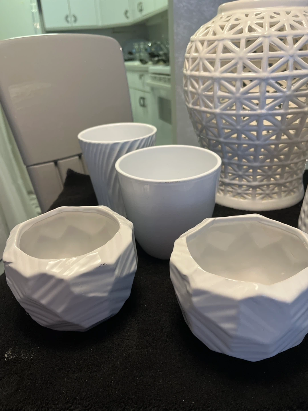 This is a collection of white ceramic decorative pieces. It includes various vases and small holders with geometric patterns. Most appear to be ceramic. These decorative pieces can be used to hold flowers or as standalone decor.