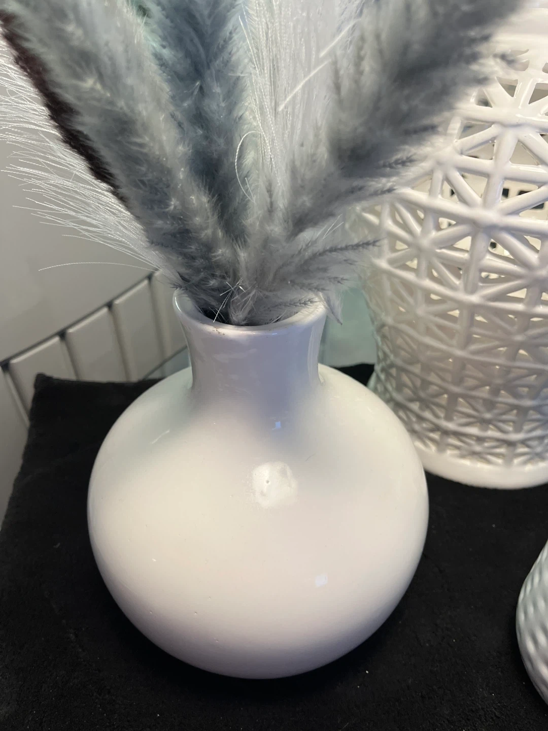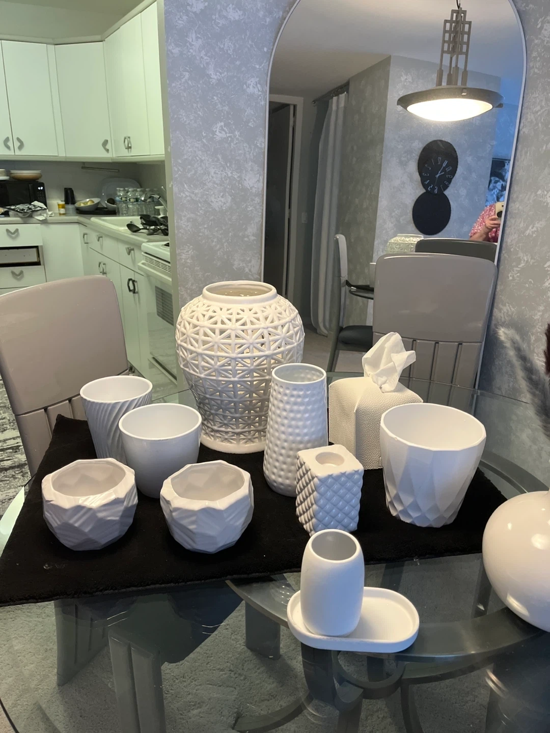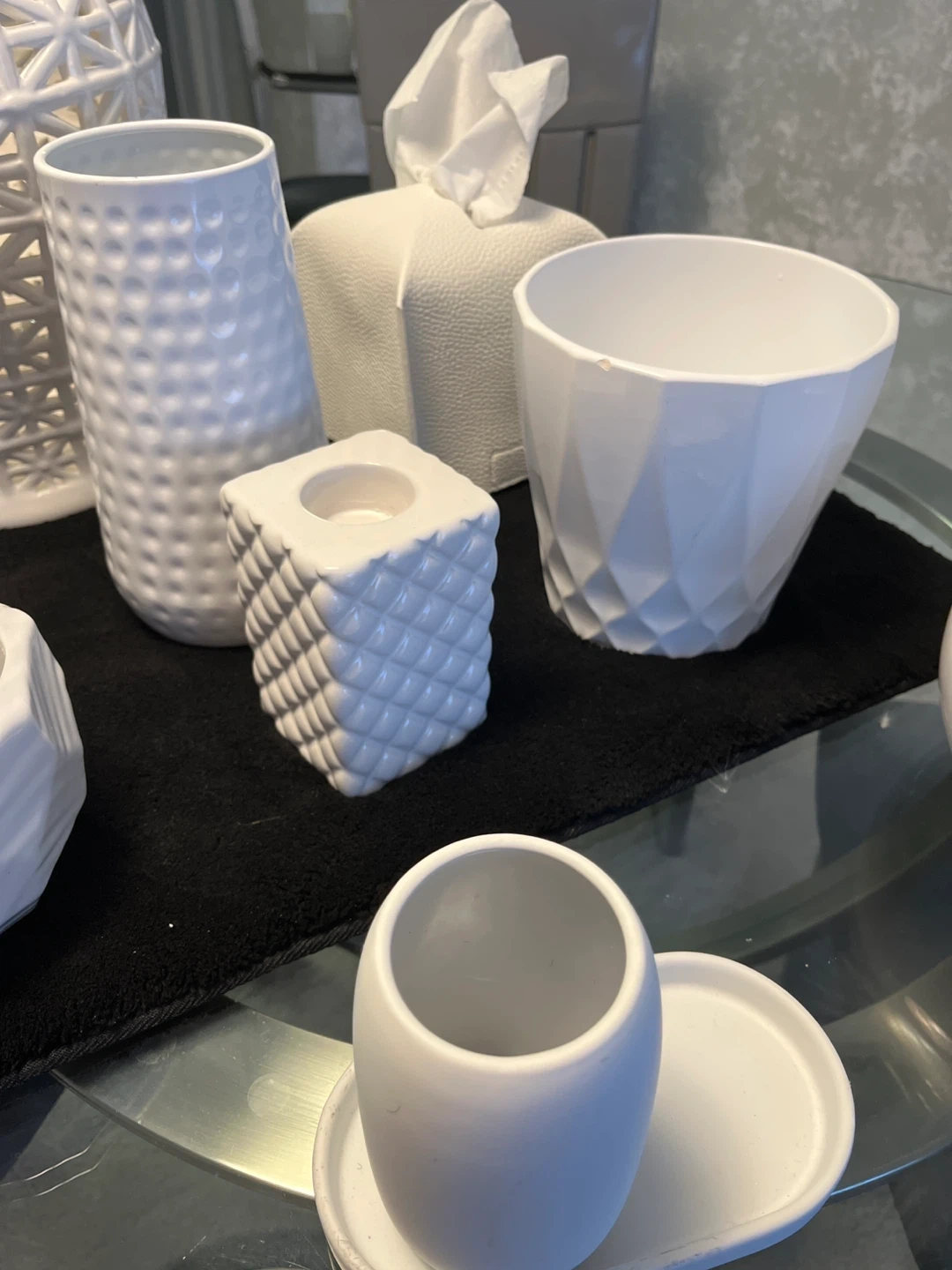 This is a collection of white ceramic decorative pieces. It includes various vases and small holders with geometric patterns. Most appear to be ceramic. These decorative pieces can be used to hold flowers or as standalone decor.