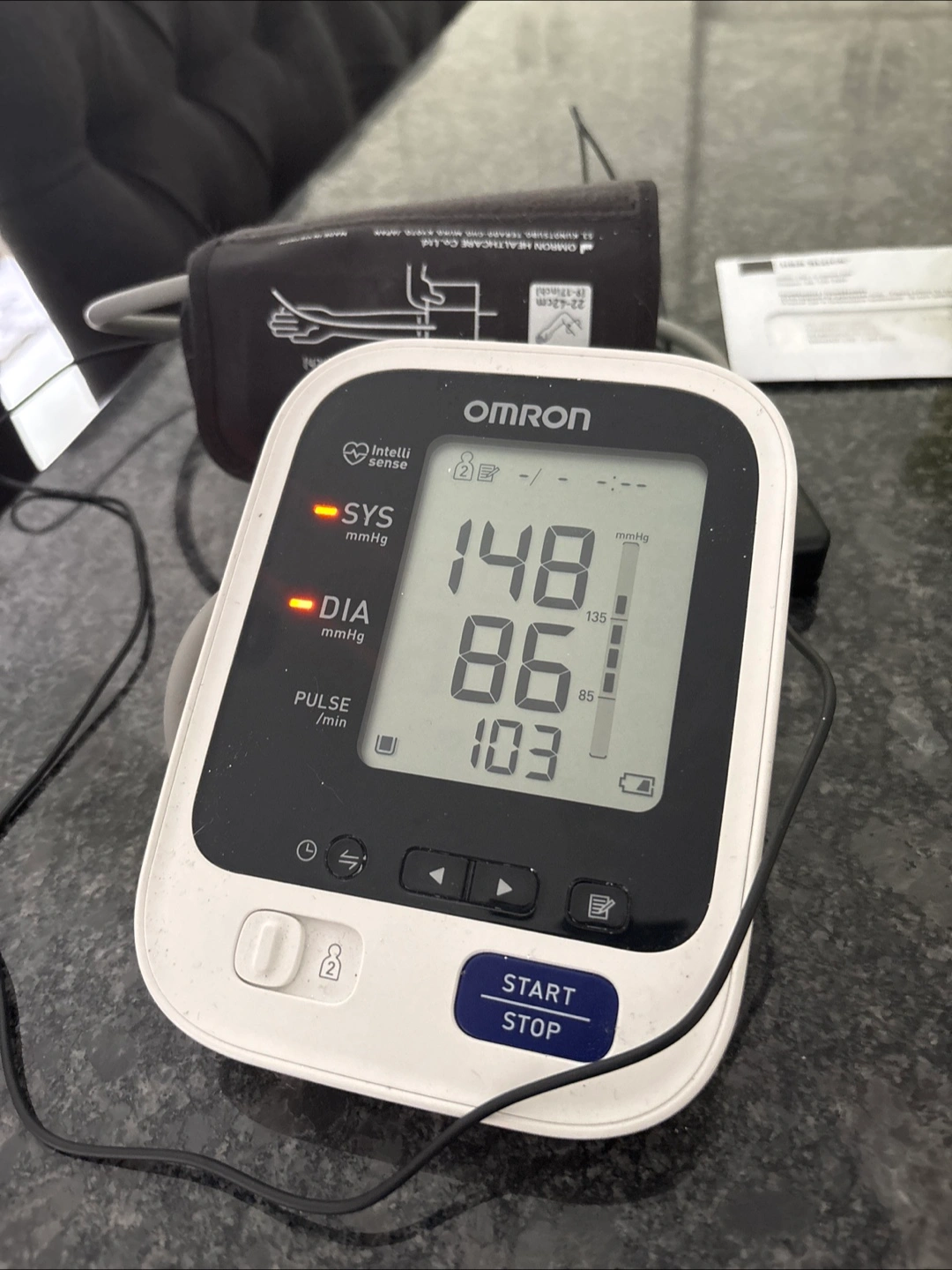 A blood pressure monitor, with an arm cuff and digital display. It shows readings of the systolic, diastolic, and pulse. Using this item allows you to keep a close eye on your health.