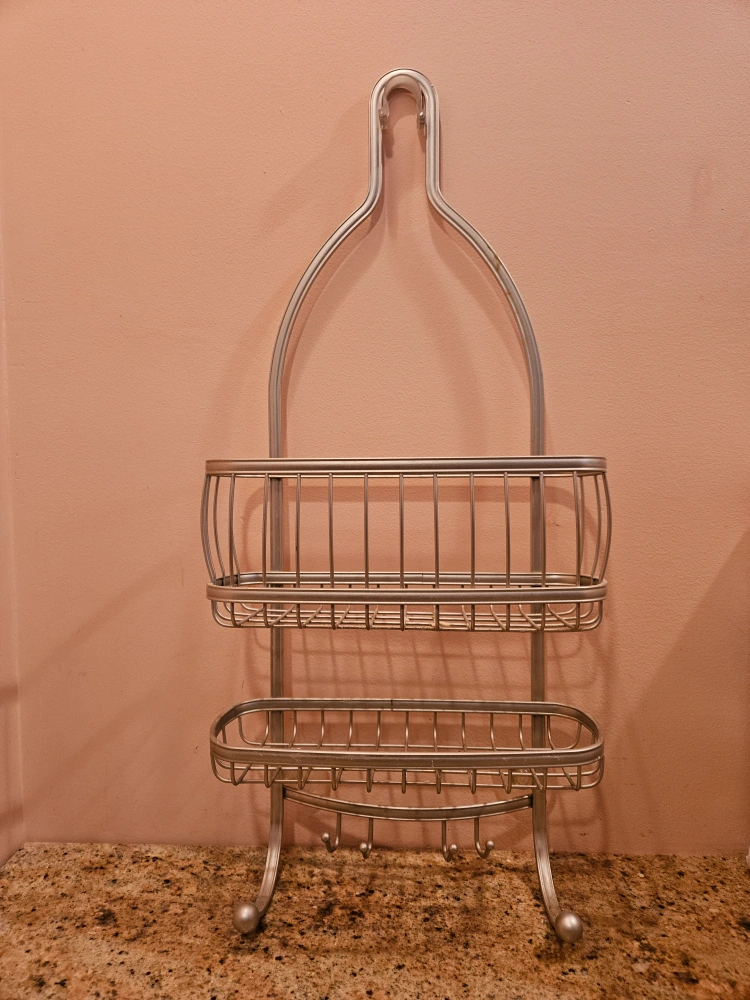 The shower caddy has a unique handle, two baskets, and hooks. The trash can is metallic with a perforated design. These items are great for keeping your space organized.
