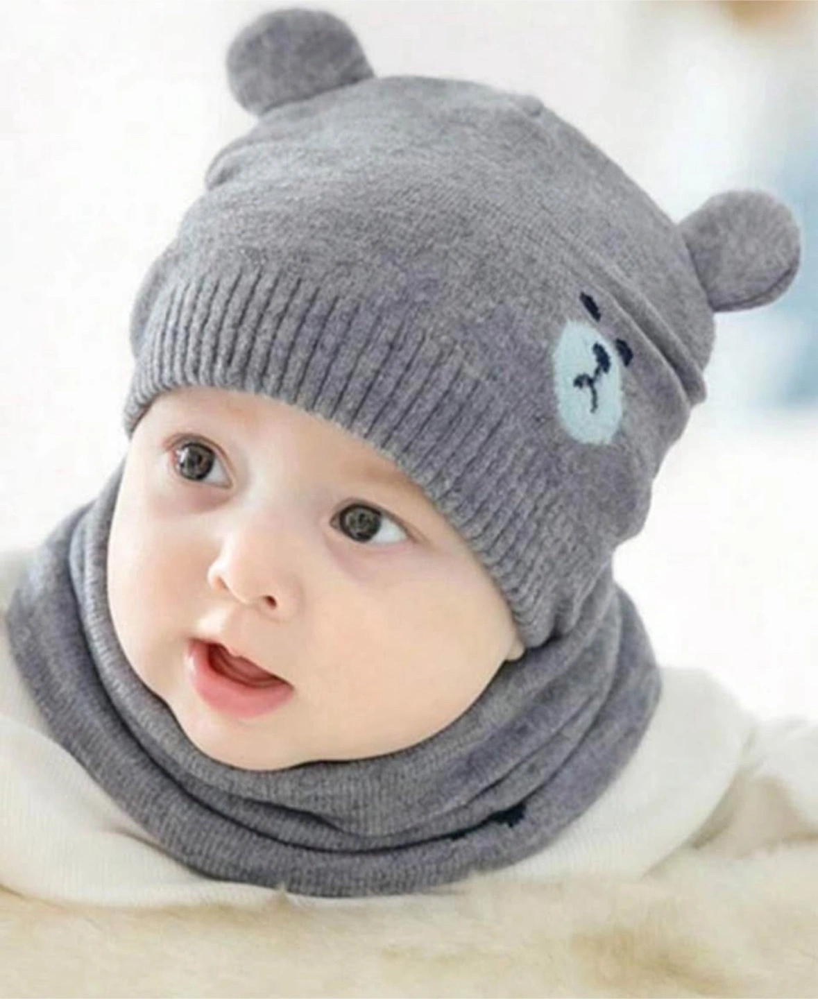 The set includes a cozy hat with bear ears and a matching neck warmer. The hat features a bear face embroidery. The neck warmer has a paw print embroidery. This set is perfect for keeping a little one warm during a winter walk.