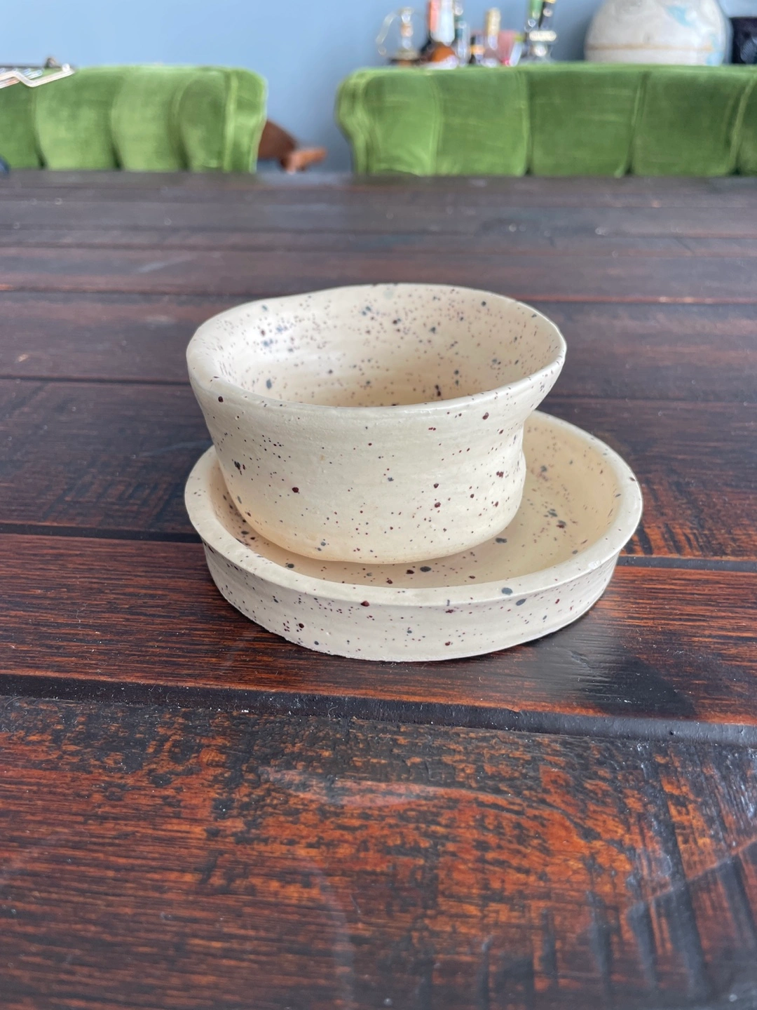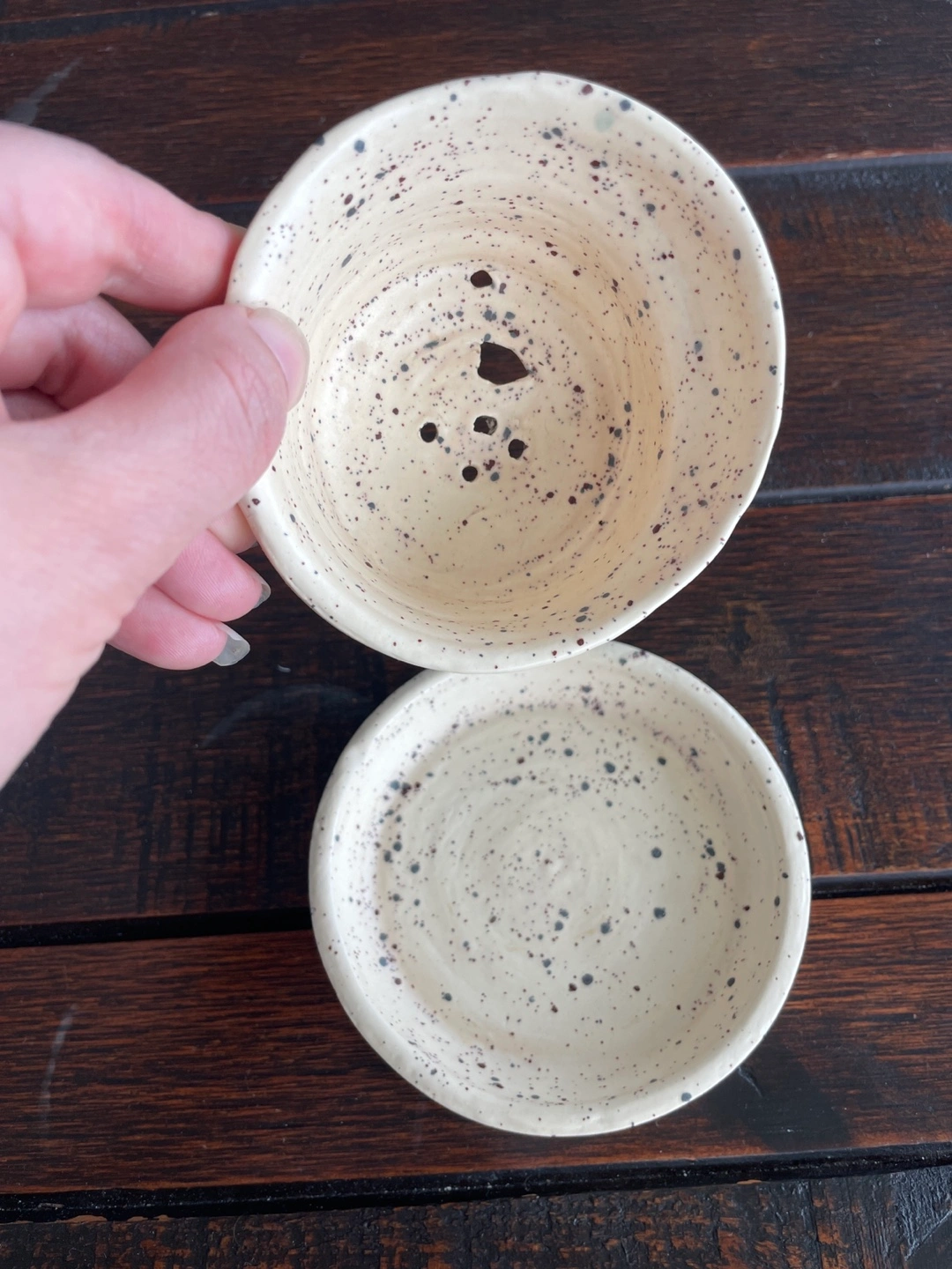 Handmade ceramic dish with holes. Includes a matching saucer. It was one of my first pieces and it’s wonky so I feel bad whenever I look at it, lol. Maybe you will like the quirk. Was made as a dish sponge drainer but could also work as a small planter. 3.5” diameter.