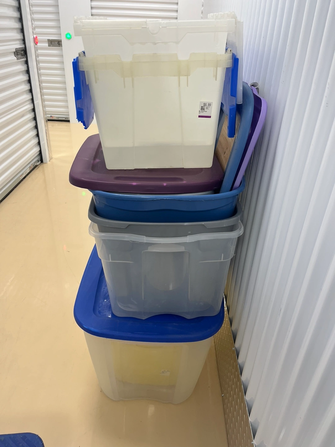 Here are some storage bins in various sizes, perfect for organizing your belongings. They feature different colours and lids. Consider them as a calming solution for tidying up any space.