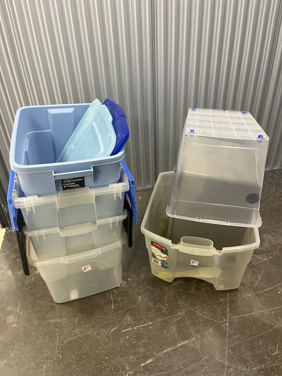 A collection of storage bins of different sizes and colours. Some bins have lids. They are perfect for decluttering your home, creating a sense of order.