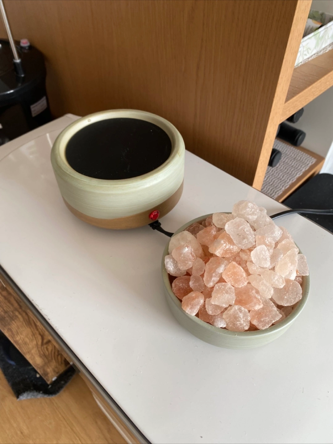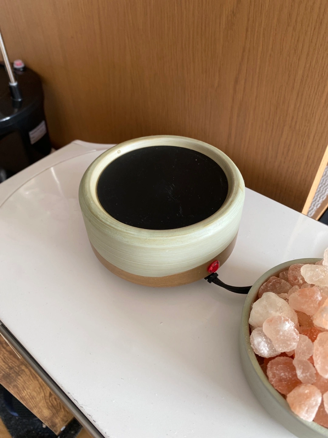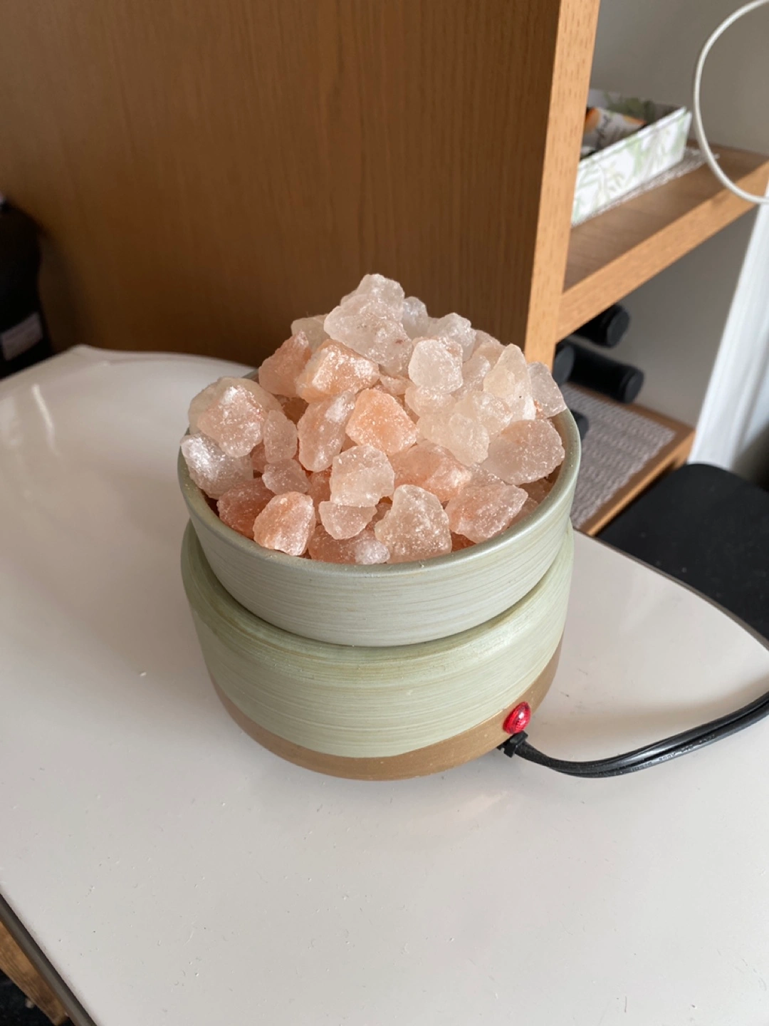 A beautiful two-part salt and wax candle warmer. Includes a ceramic base with a heating element. The salt crystals go in the top. You will love the calming effect this lamp has on any room.