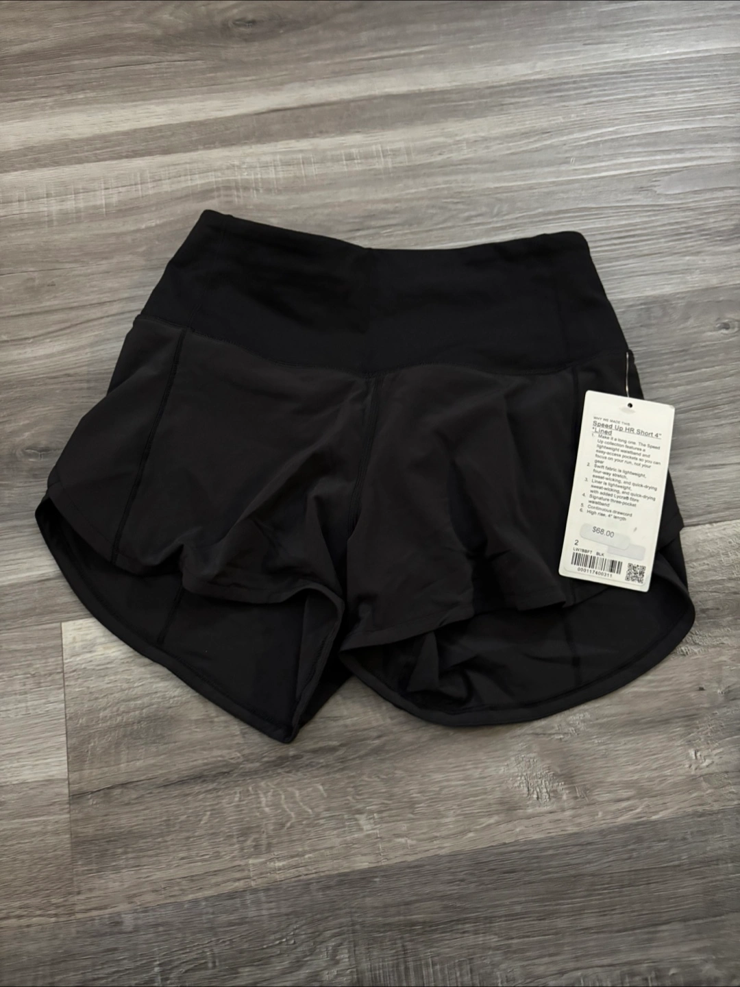 The Speed Up HR Short from Lululemon. These black shorts feature a high rise and a continuous drawcord. The Swift fabric is lightweight and sweat-wicking. A perfect addition to any active wear collection, it will make you feel relaxed.