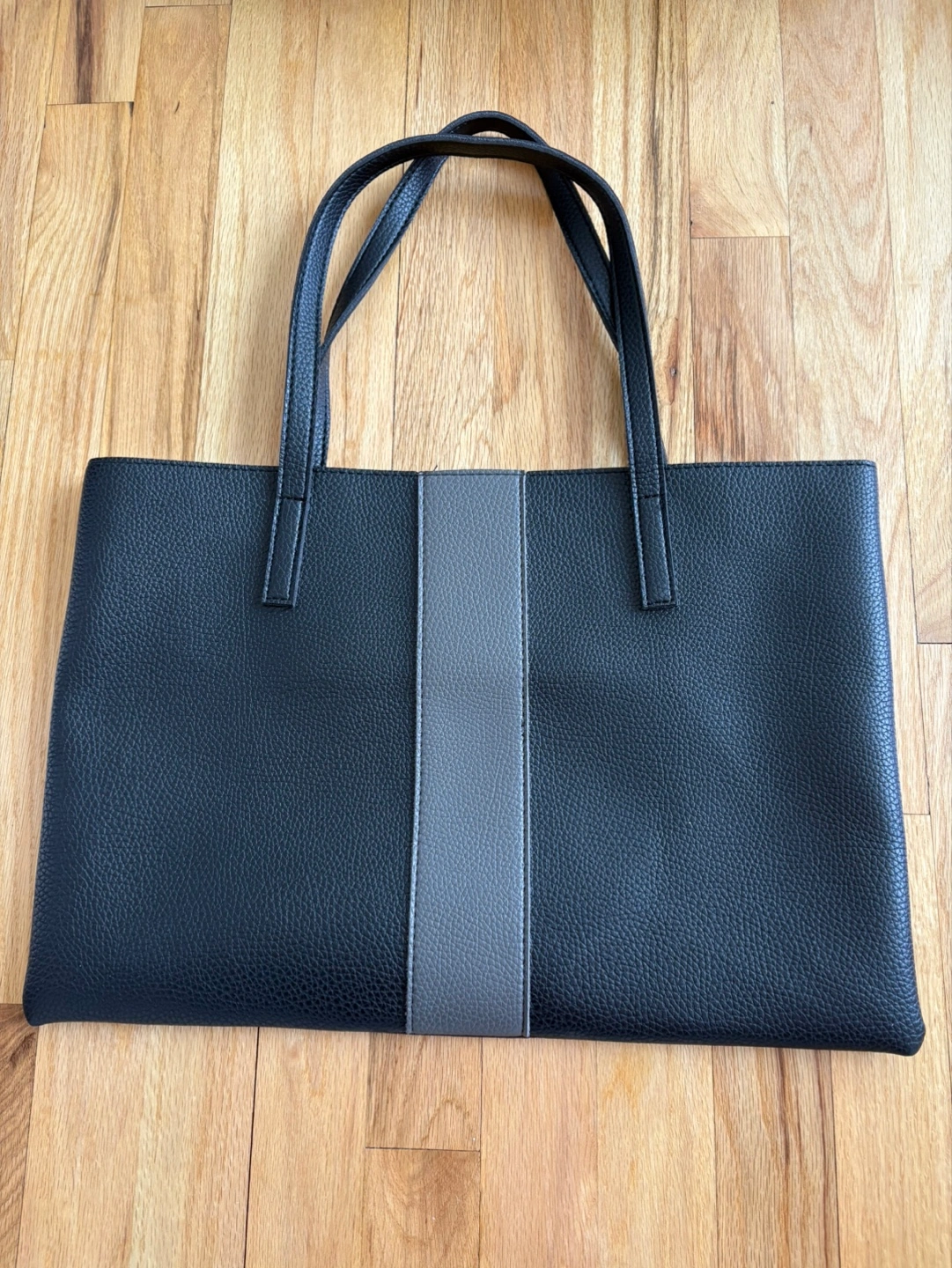 A black tote bag. Features a rectangular shape with two handles. A light gray stripe down the middle of the bag. The bag is black with a grainy texture. Such a great bag to take shopping, or to the office.