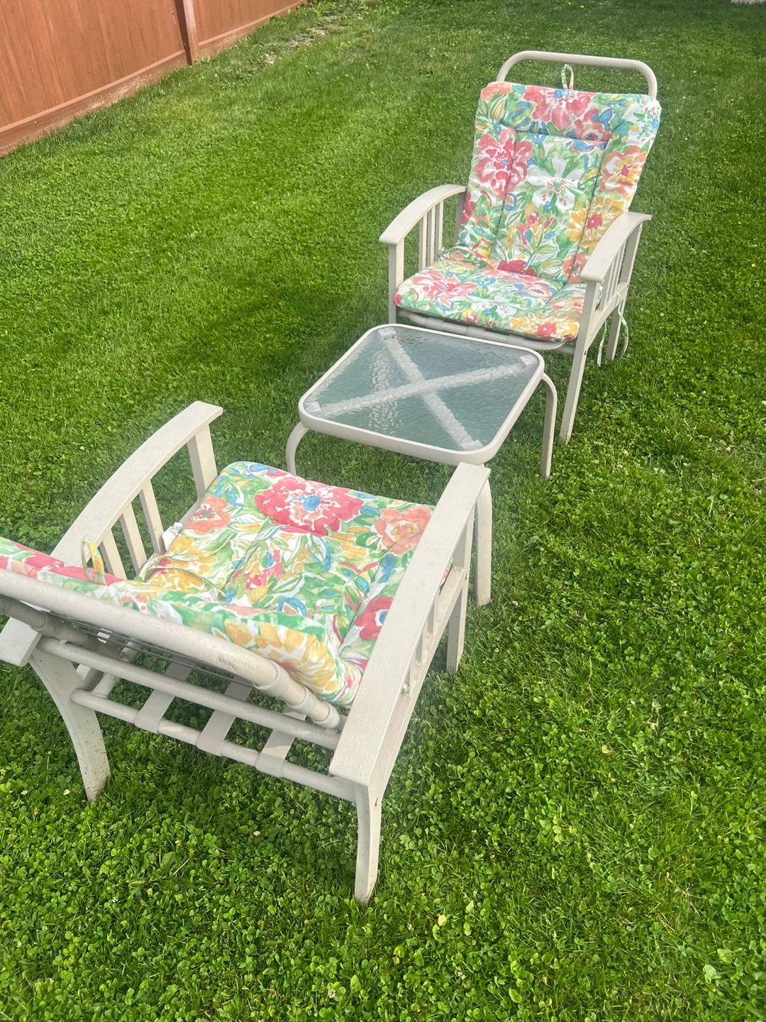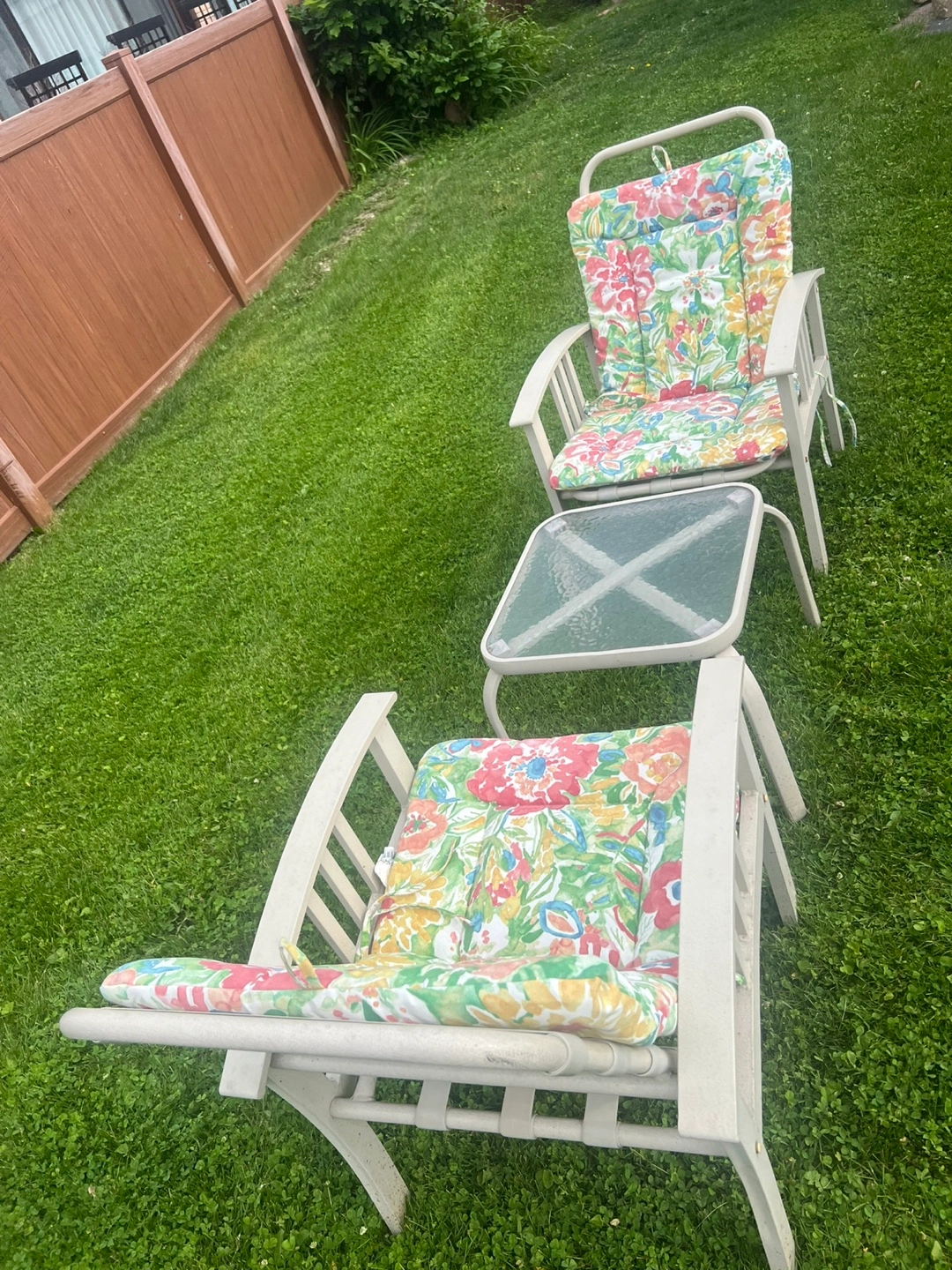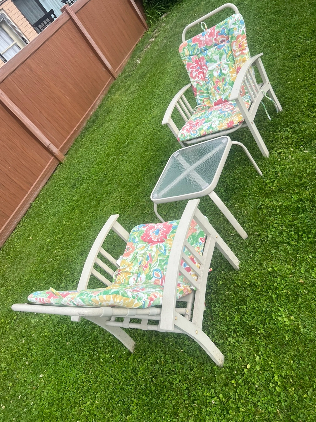 Set of 2 aluminum chairs w/cushion for Outdoor/ Patio and small table.