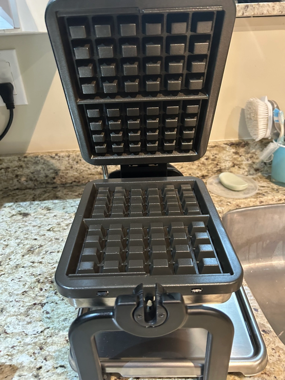 Waffle maker with a stainless steel finish. Has a black handle and a dial on top. It opens up revealing the waffle griddle. Start your day with a simple, delightful breakfast.