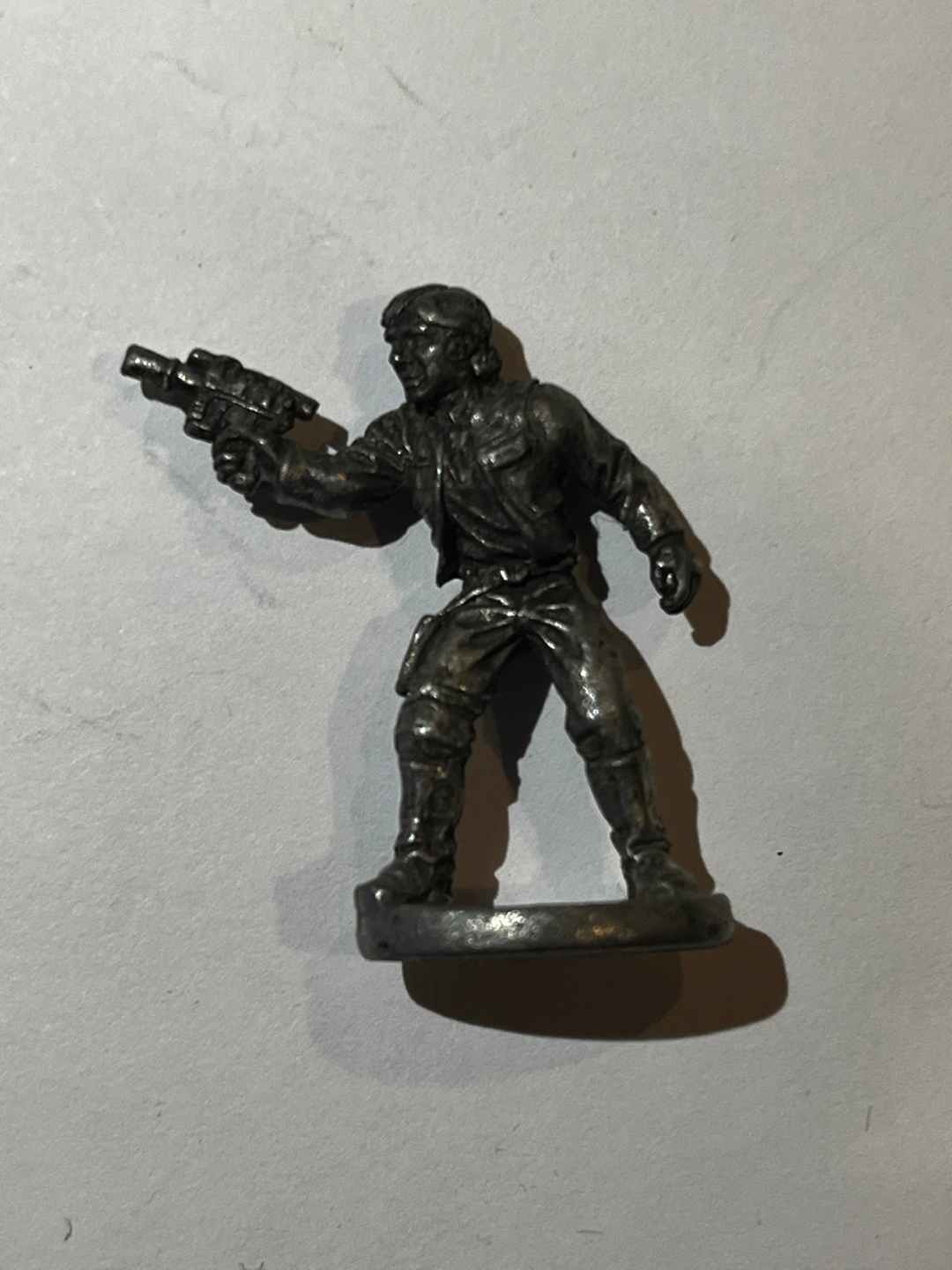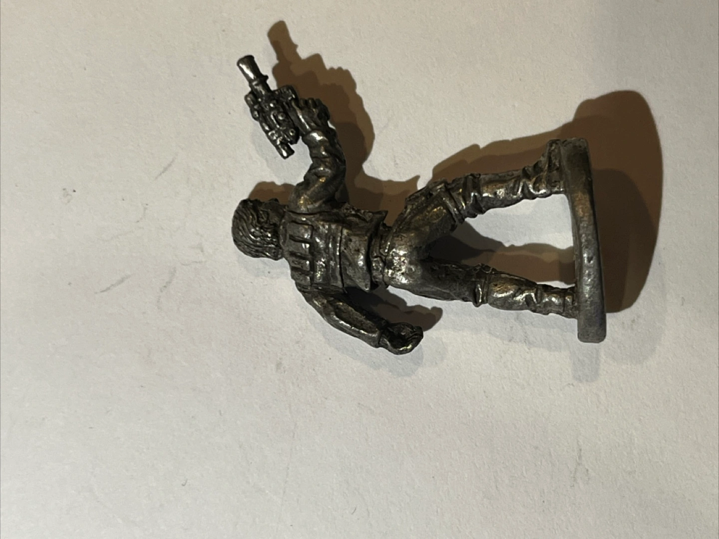Metallic figure, possibly a soldier. Has a weapon in hand, perhaps a pistol. Very neat looking miniature. Put it on your desk for a little reminder of a heroic battle.