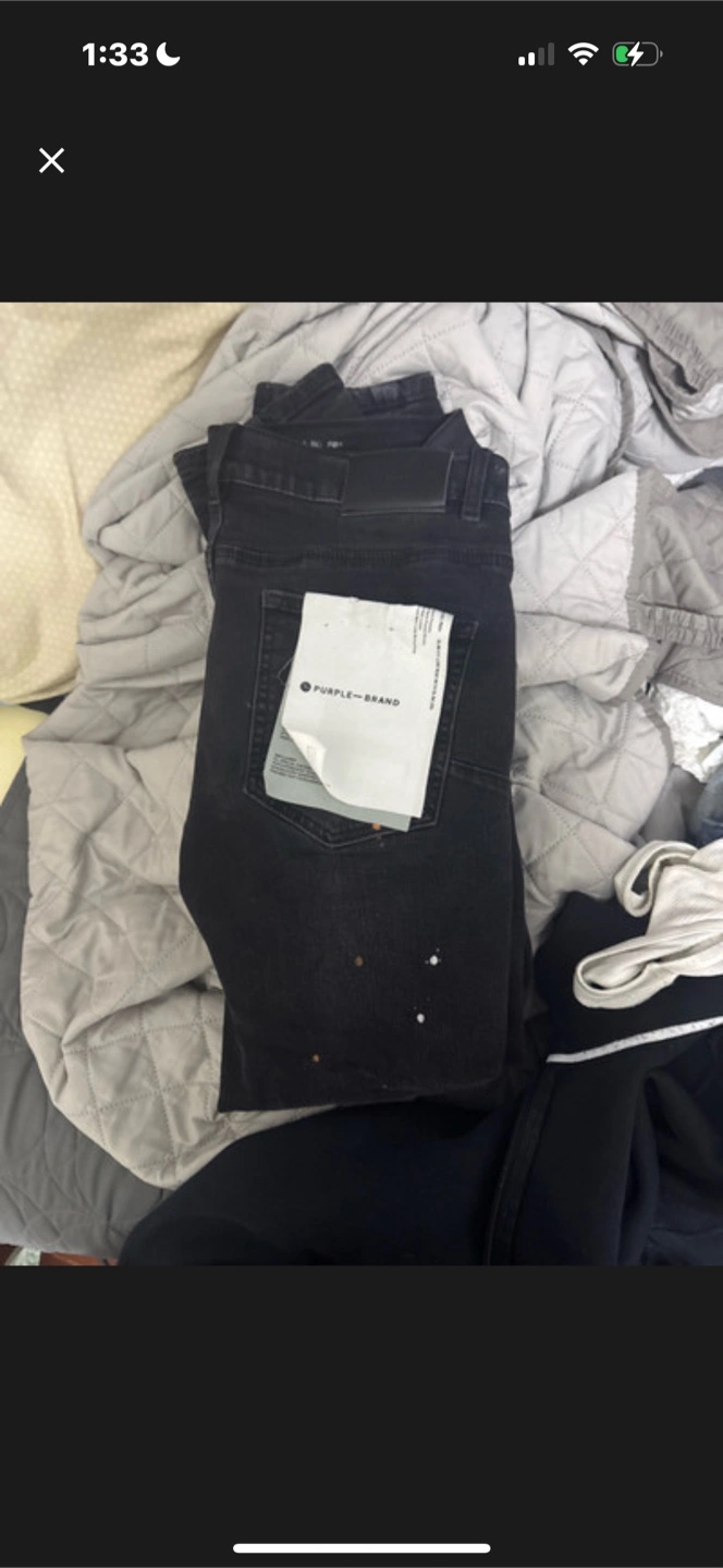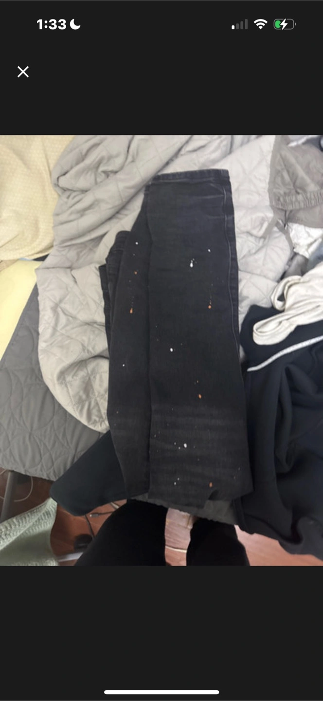 A pair of black jeans. Straight leg. Featuring paint splatter detailing. You can always find comfort in a good pair of jeans.