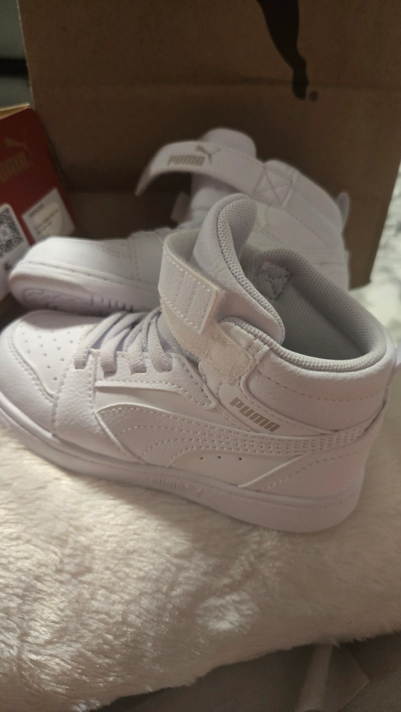 White sneakers. Shoes with a velcro strap, lace up closure, and a high top design. Bought the wrong size for my son.Brand new never used