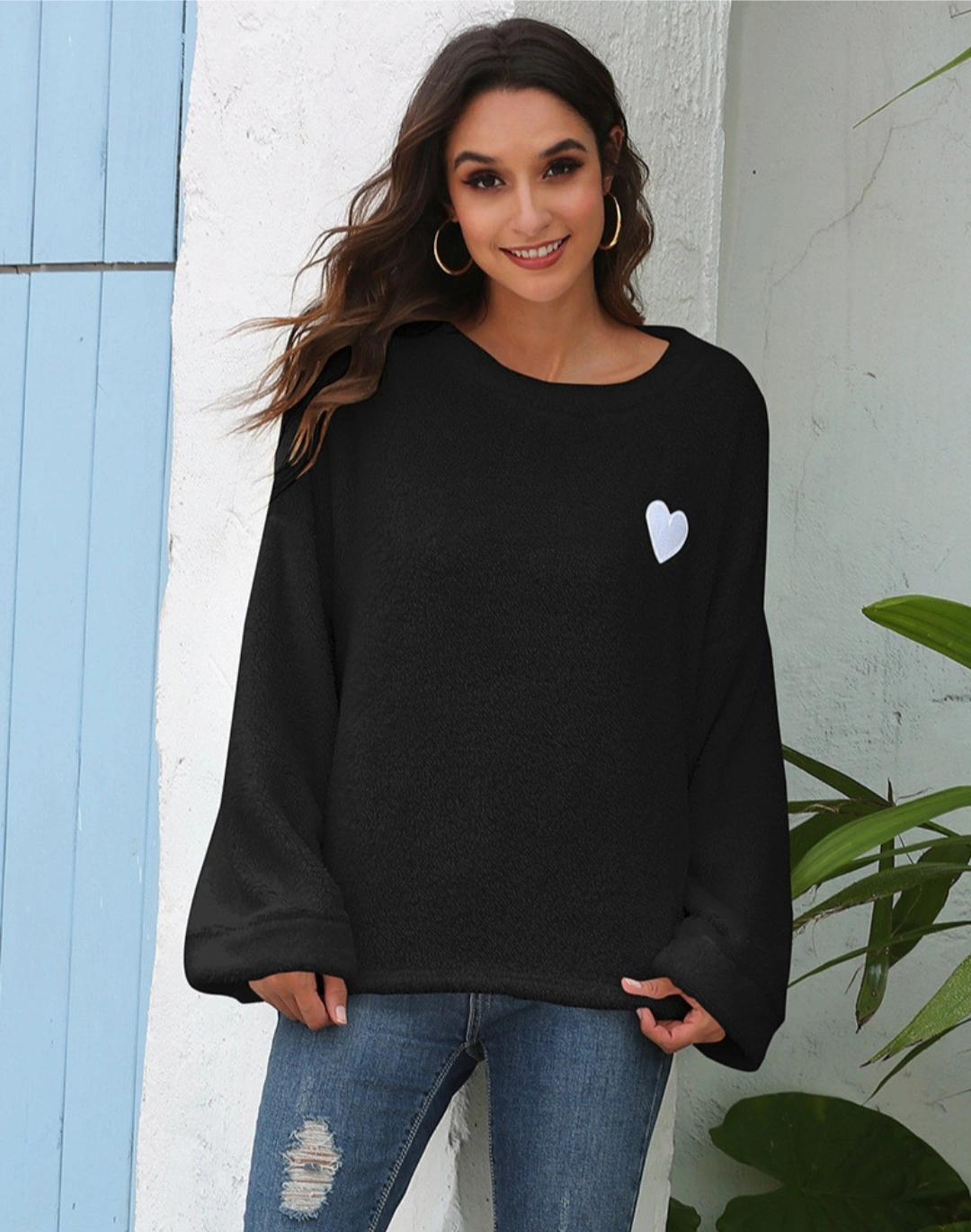 Cozy! Black & White Heart Pocket Plush Crewneck Sweatshirt